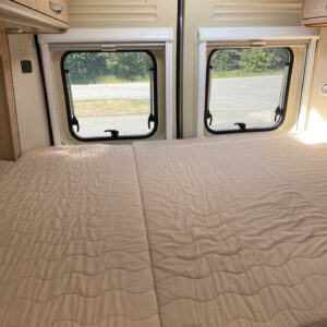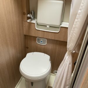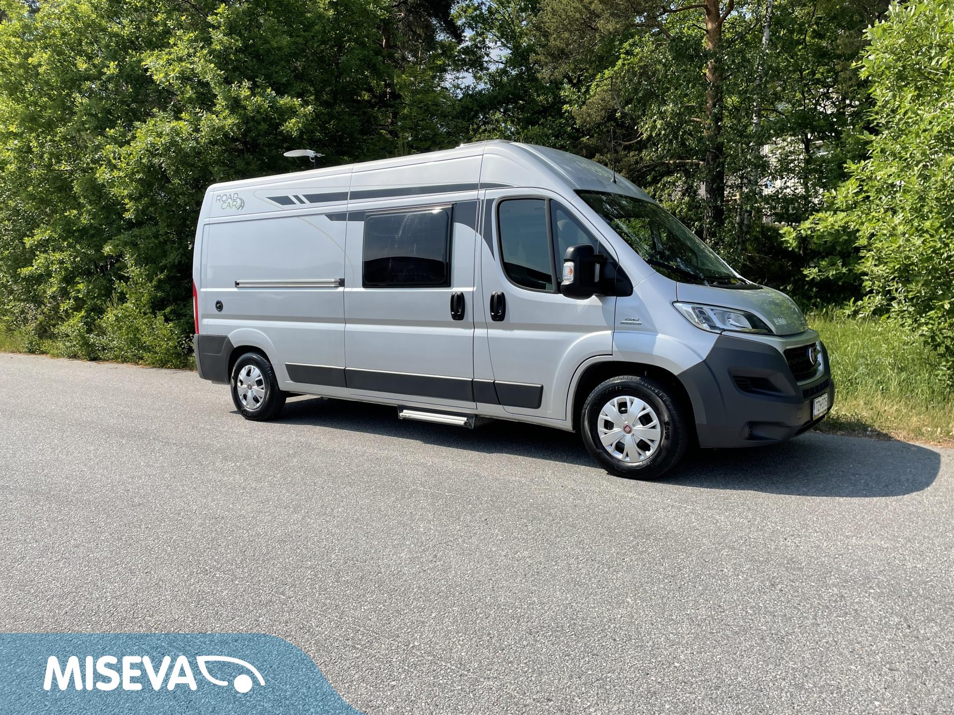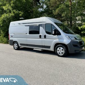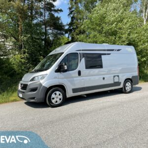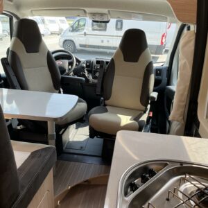 Takana parivuode ja alla hyvä tavaratila, keskellä pesuhuone ja keittiö, edessä istuinryhmä 4:lle kääntyvin ohjaamon penkein