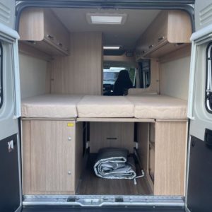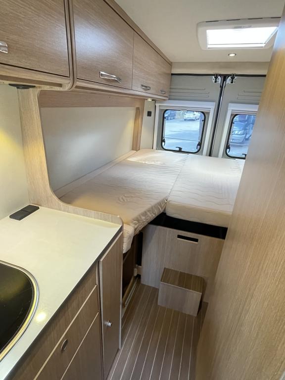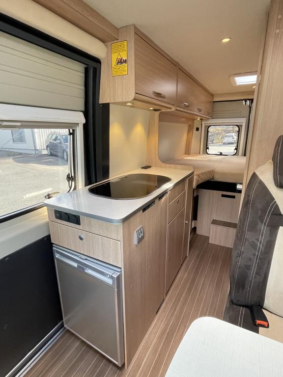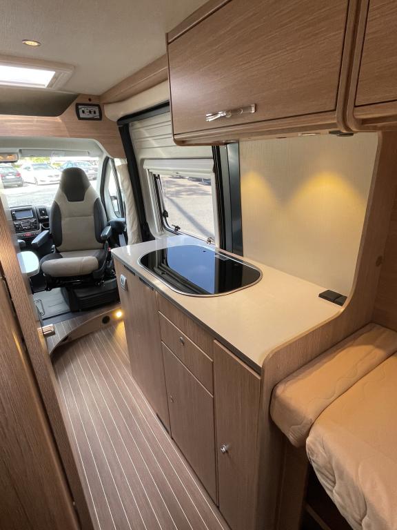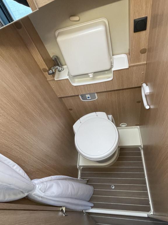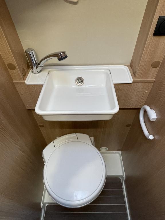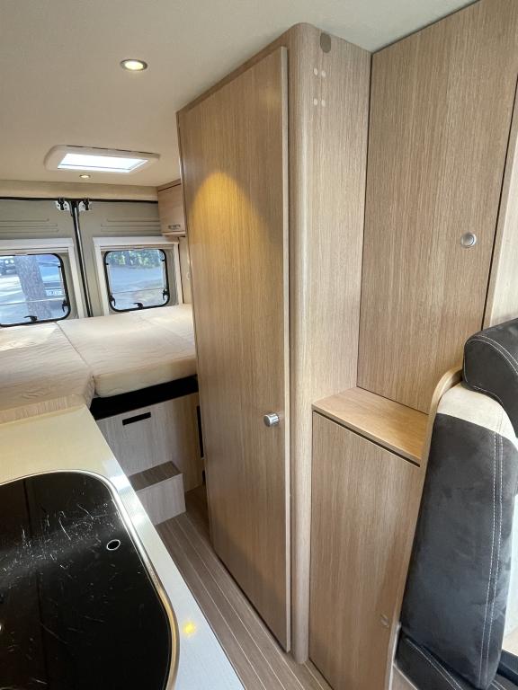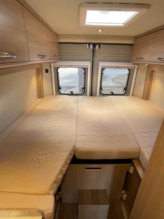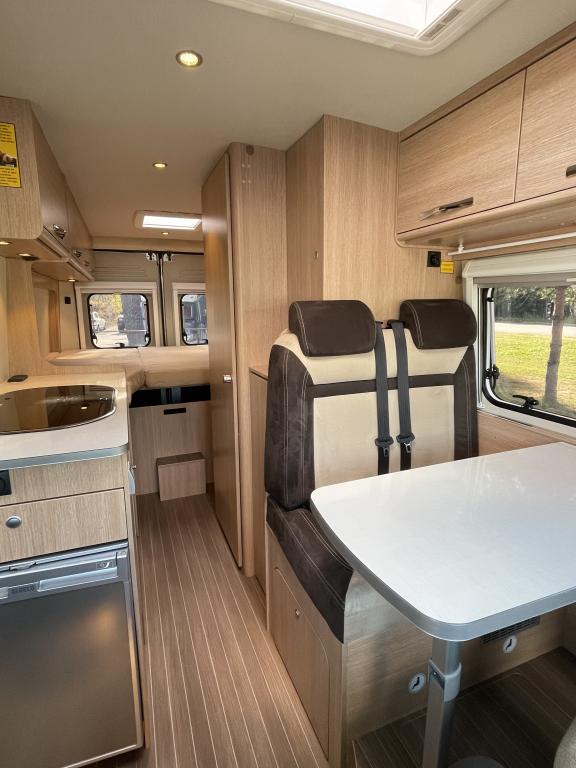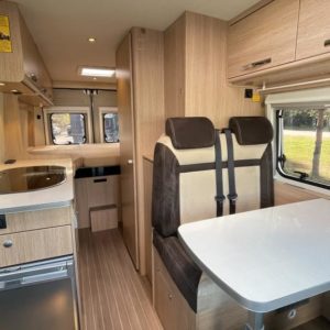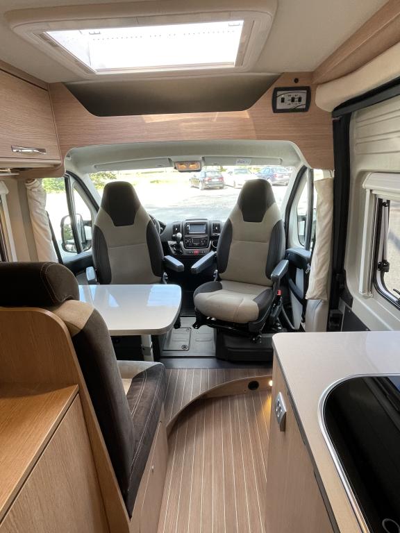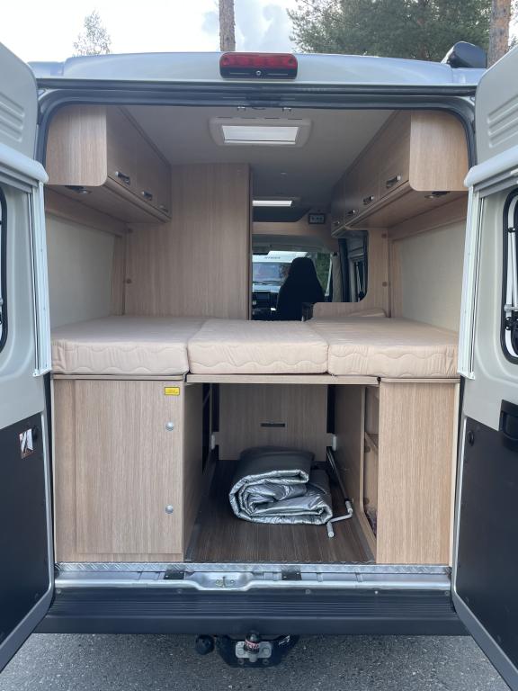 Pohjaratkaisussa edessä kääntyvät etuistuimet sekä sohvaryhmä. Keskiosassa keittiö jääkaappi pakastelokerolla ja Wc & Suihkutila. Takaosassa parivuode jonka alla hyvin säilytystilaa.