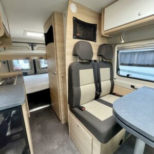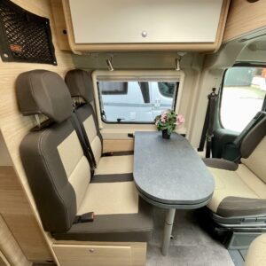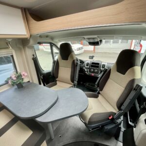 Auton etuosassa on viihtyisä ja valoisa istuinryhmä neljälle.