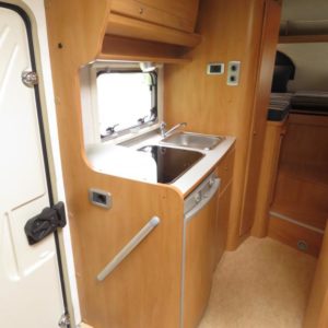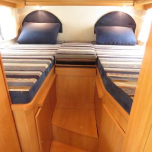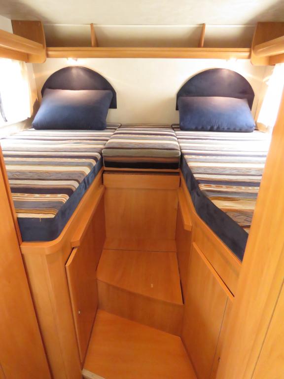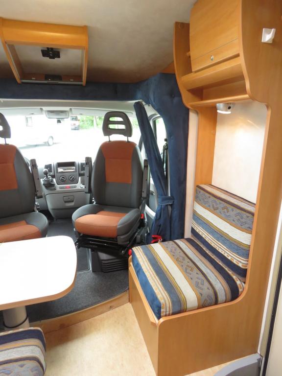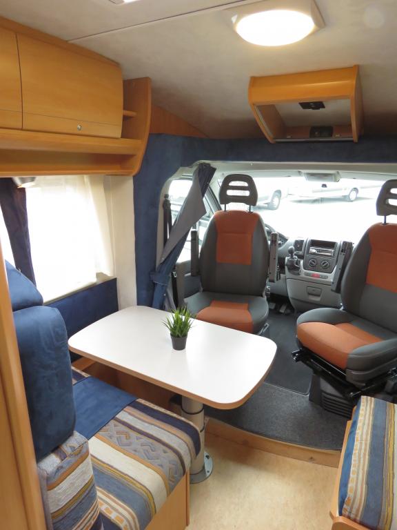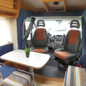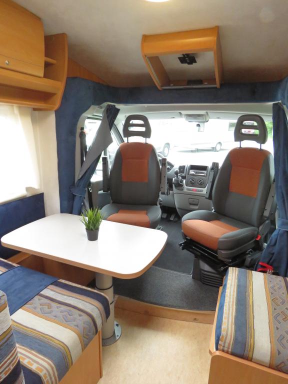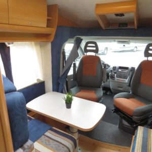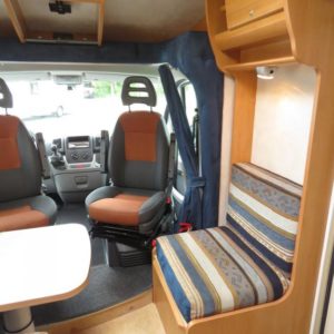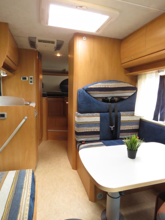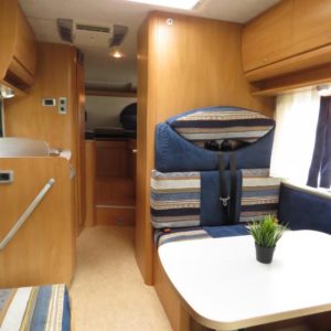 Auton takaosassa pitkittäiset erillisvuoteet, edessä pöytäryhmä sivusohvalla.