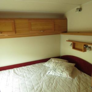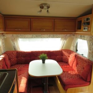 Vaunun takaosassa mukava parivuode, edessä viihtyisä pöytäryhmä.