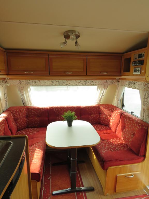 Vaunun takaosassa mukava parivuode, edessä viihtyisä pöytäryhmä.