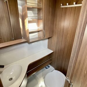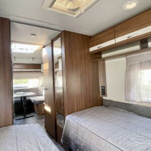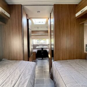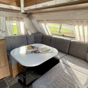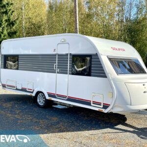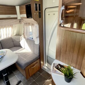 50-vuotis juhlamallia kaupan. Oven avatessa huomaa että upea vaunu on kyseessä. Lattian visuaalinen ilme huokuu erilaisuutta massan keskellä. Tummat puunsävyt vaunun sisällä luovat rauhallista kontrastia sisustukseen. Etuosan pöytäryhmän saa muutettua lepotilaksi ja muutoin siihen mahtuu helposti neljä syömään. Keittiö on tyylikäs kaappitiloineen ja vierestä löytyy kätevästi iso kokoinen jääkaappi pakastimella. Tyylikkyys jatkuu vaunun takaosassa erillissängyillä ja kaappitilaa löytyy kivasti niiden yläpuolelta. Wc:ssä erikoisuutena löytyy oma kuivaustelineensä. Ehdottomasti tutustumisen arvoinen vaunu, jos kaipaat vähän jotain massasta poikkeavaa tyyliä.