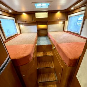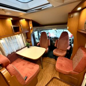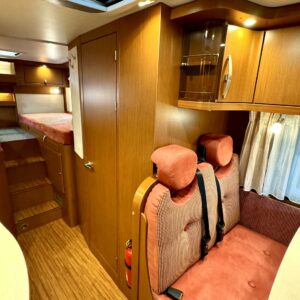 Edessä tilava pöytäryhmä ja keskellä ajoneuvoa tilava keittiö, josta löytyy erillinen jääkaappi ja pakastin sekä tilava saniteettitila josta löytyy myös suihkumahdollisuus. Tästä oiva vaihtoehto pariskunnille tai yksin matkaaville.