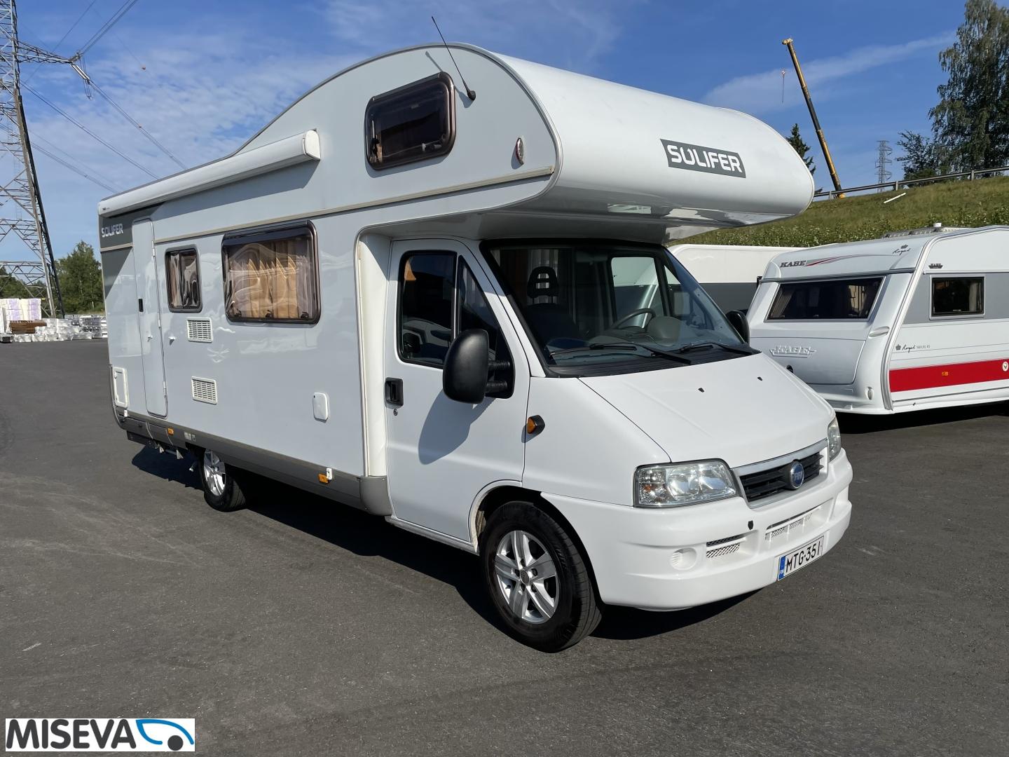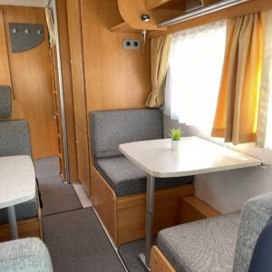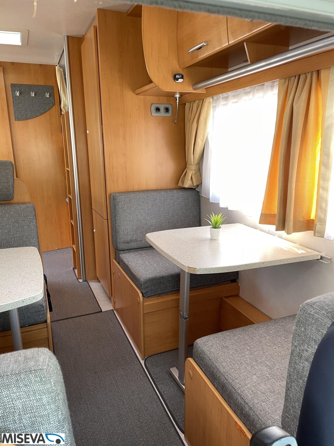 Haluttu pohjaratkaisu 2:lla pöytäryhmällä. Takana kerrosvuoteet pitkittäin ja kulmassa tilava pesuhuone, keskellä keittiö,edessä ne istuinryhmät ja ohjaamon päällä alkovivuode.