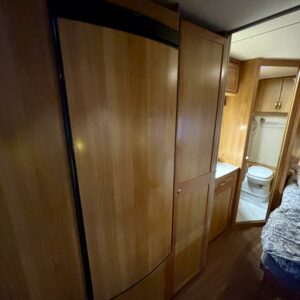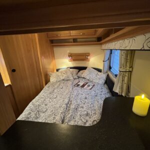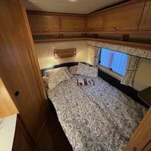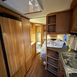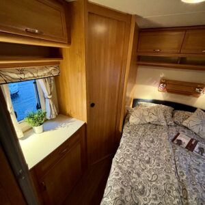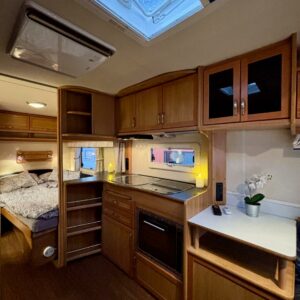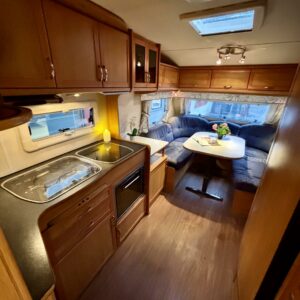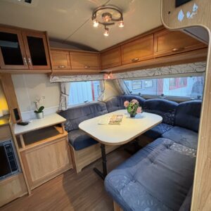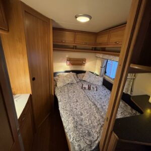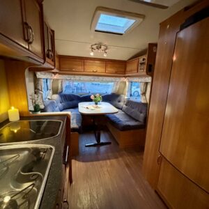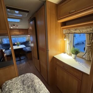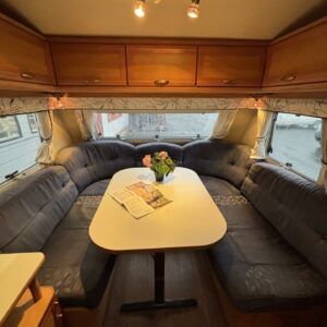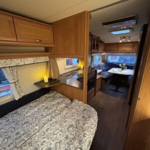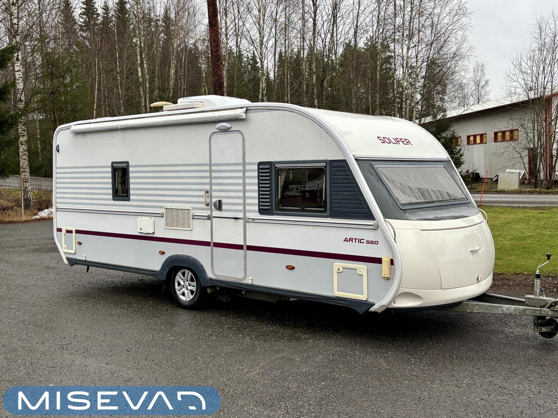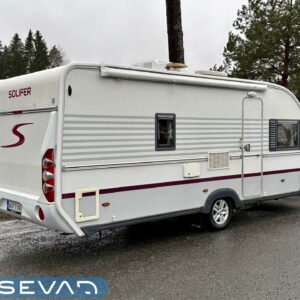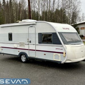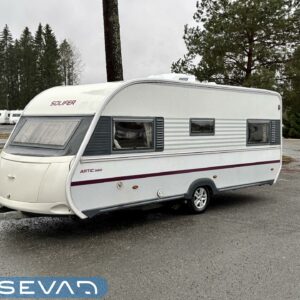 Ehdottomasti talvivaunu genreen laskettava tapaus! Pohjolan oloihin suunniteltu ja valmistettu ”Solikka”. Lämmitysjärjestelmänä Alden 6 kilowattinen (kaasulla) nestekiertolämmitys ja näissähän on myös aina lattiakierto yhdistettynä järjestelmään. Roikan päässä saadaan 3 kilowattia lisää sähkövastuksista, joten eiköhän ala riittämään keliin kun keliin. Muutenkin mukavasti varusteltu, eli löytyy vaununsiirtolaite, ilmastointi ja kaasu-uuni. Vaunun takaosasta löytyy makkari missä on pitkittäinen parivuode. Välittömässä läheisyydessä on kylppäritilat, sekä pieni työpöytä syvennys. Keskelle on asemoitu keittiö missä on varusteina mm. kaasu-uuni, sekä iso jääkappii ihanteelliselle käyttökorkeudelle sijoitettuna. Etuosaa hallitsee U-ryhmä mistä saadaan tarvittaessa vuode kahdelle henkilölle. Mainittavan arvoinen asia vaunun toiminnallisuuden kannalta on heti käyntioven läheisyydessä oleva vaatesyvennys, on kyllä kätevä heittää tähän sisään tullessa ulkovaatteet ja kengät eikä tarvitse alkaa niitä sullomaan johonkin vaunun vaatekaapeista. Vaunulla on ollut historiansa aikana vain yksi käyttäjäomistaja.
