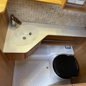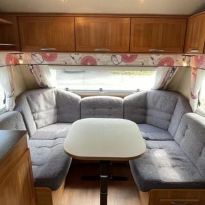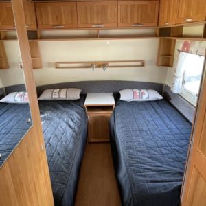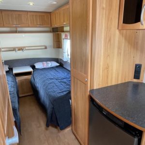 Pohjaratkaisussa edessä U- Sohvaryhmä josta pedattavissa lisävuode. Keskiosassa keittiö jääkaappipakastin- yhdistelmällä sekä Wc- tila. Takaosassa erillisvuoteet.