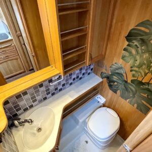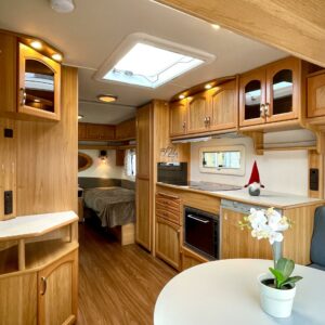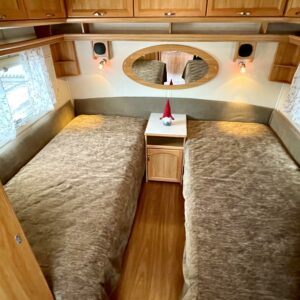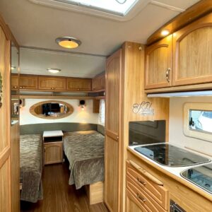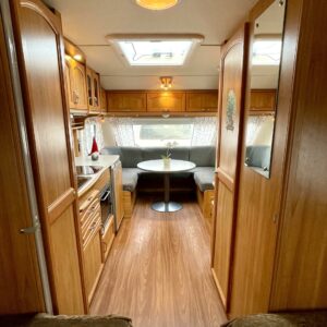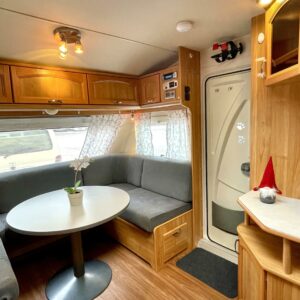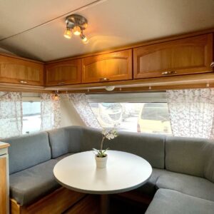 Vaunun etuosaa hallitsee tilava U-pöytäryhmä, jonka verhoilu on uusittu ja pöytä vaihdettu tyylikkääseen ja kätevän kokoiseen pyöreään malliin. Keskiosan avarassa tuvassa on hyvällä laskutilalla ja kaasu-uunilla varusteltu keittiö sekä täysikokoinen vaatekaappi. Keittiötä vastapäätä sijaitsevat takkinaulakon taakseen kätkevä TV-kaluste ja tilava kylpyhuone bidee-suihkulla ja kasetti-WC:llä. Vaunun takaosan makuuhuoneen rauhasta löytyvät täysikokoiset erillisvuoteet kahdelle aikuiselle.