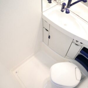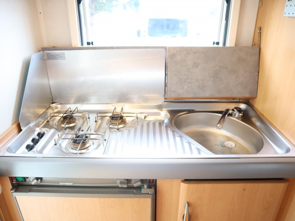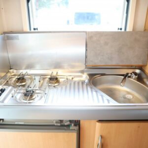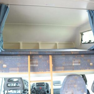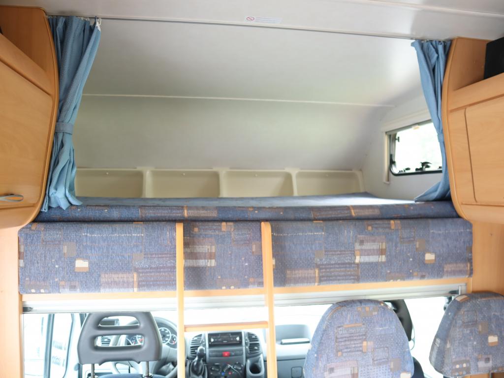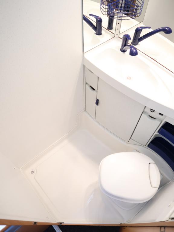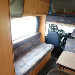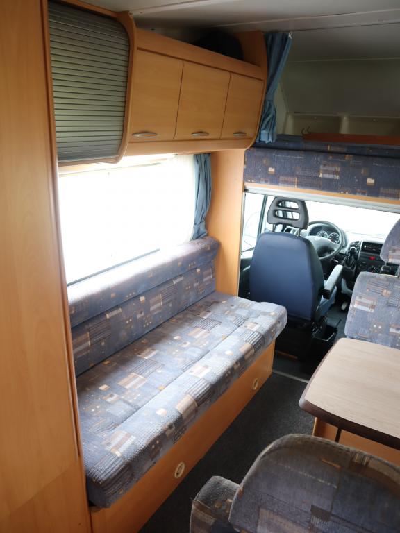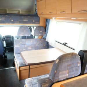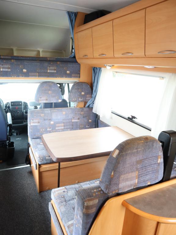 Avara pohjaratkaisu; Keittiö ja pesuhuone/ WC auton takaosassa, vastakkainistuttava pöytäryhmä ja pitkä sivusohva etuosassa. Levää parivuode löytyy auton alkovista.