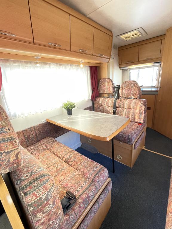 Auton takaosassa keittiö ja pesuhuone/ WC, edessä pöytäryhmä sivusohvalla ja leveä alkovivuode.