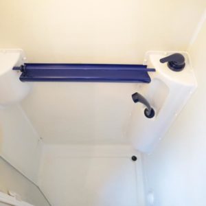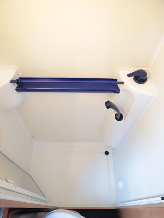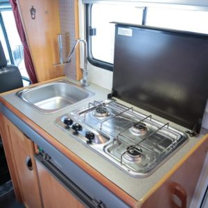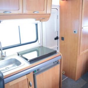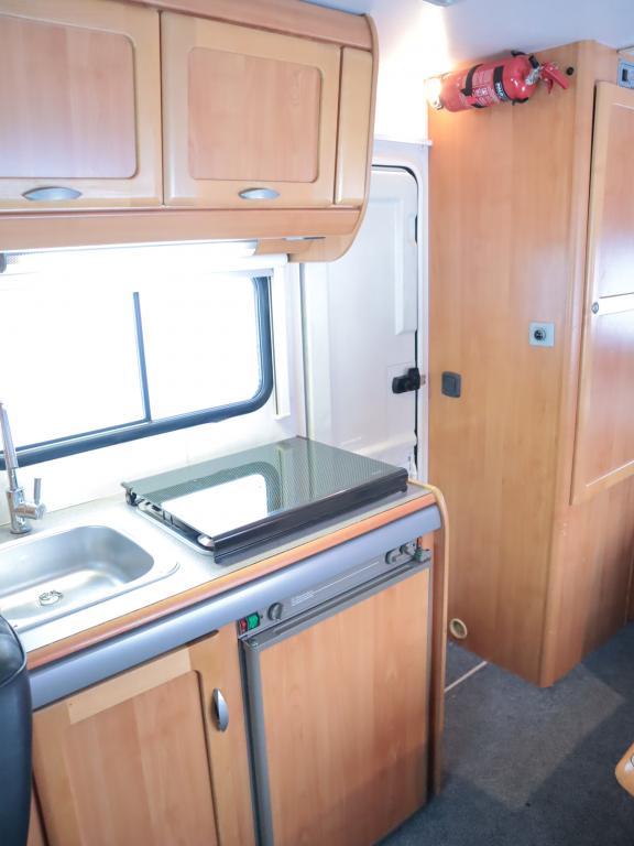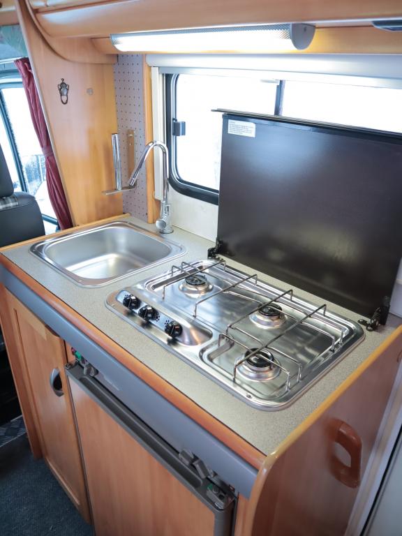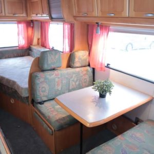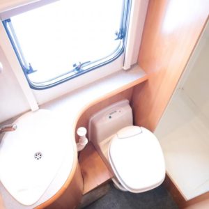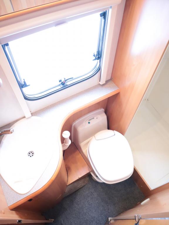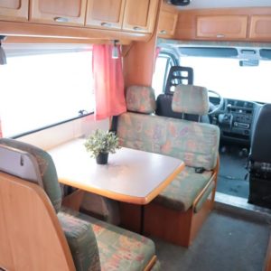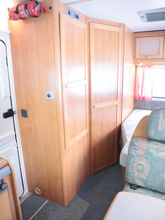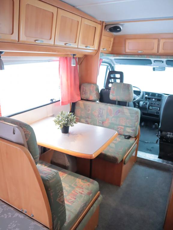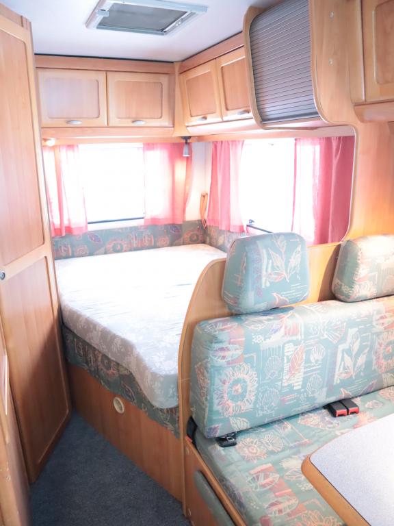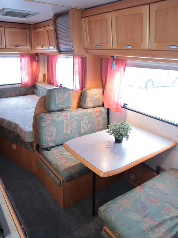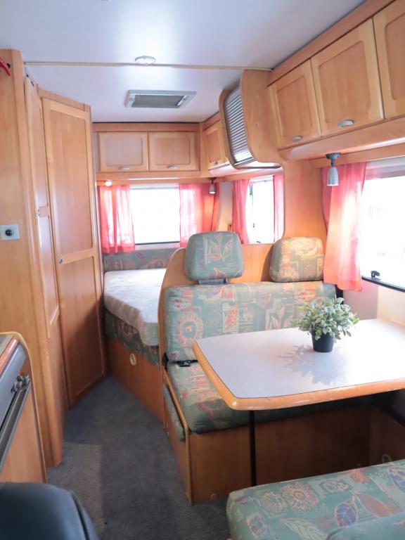 Auton takaosassa pitkittäinen parivuode ja pesuhuone erillisellä suihkunurkkauksella, edessä pöytäryhmä neljälle. Pöytäryhmä sijattavissa toiseksi parivuoteeksi.