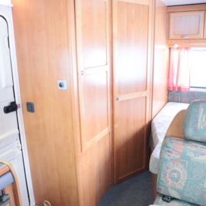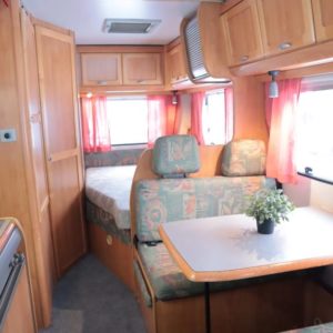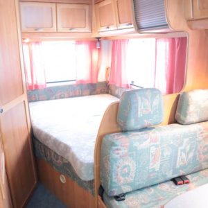 Auton takaosassa pitkittäinen parivuode ja pesuhuone erillisellä suihkunurkkauksella, edessä pöytäryhmä neljälle. Pöytäryhmä sijattavissa toiseksi parivuoteeksi.