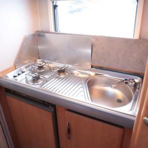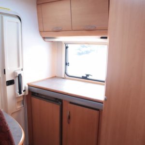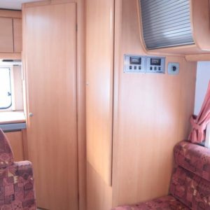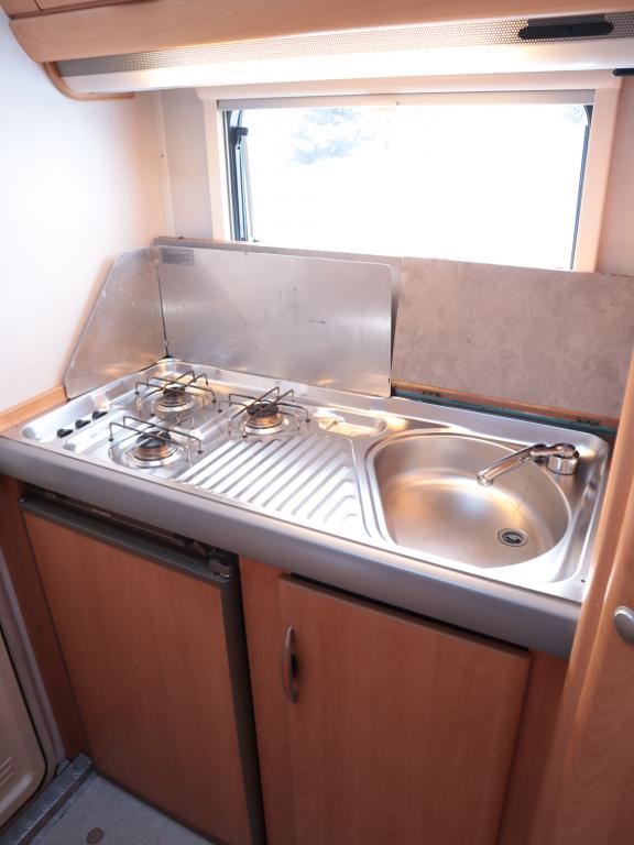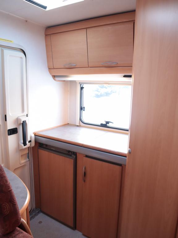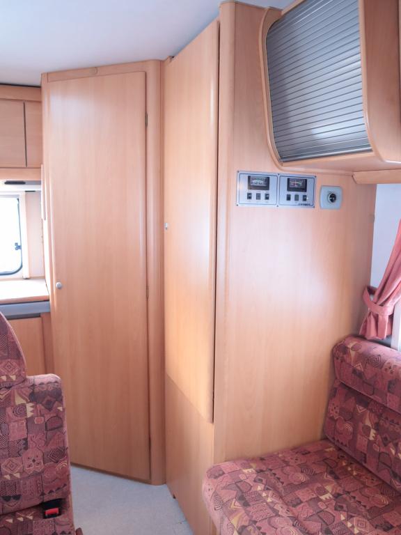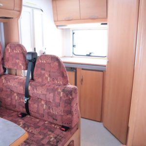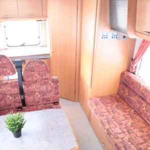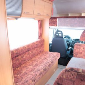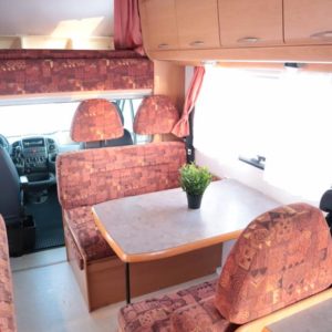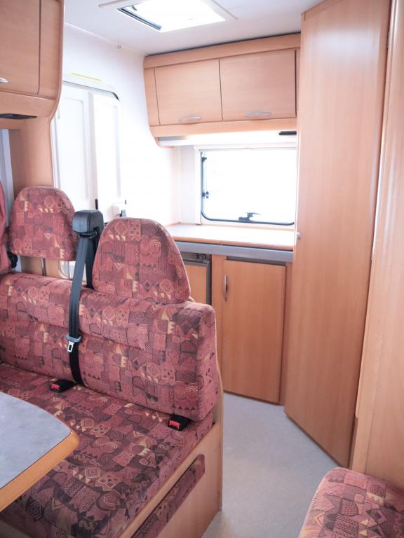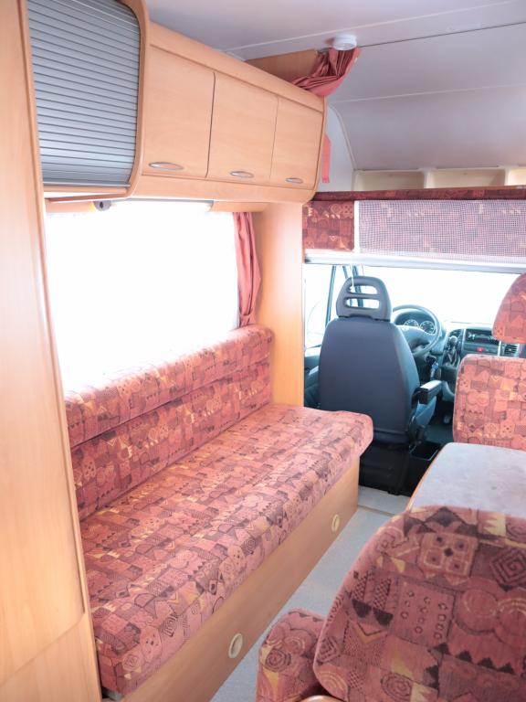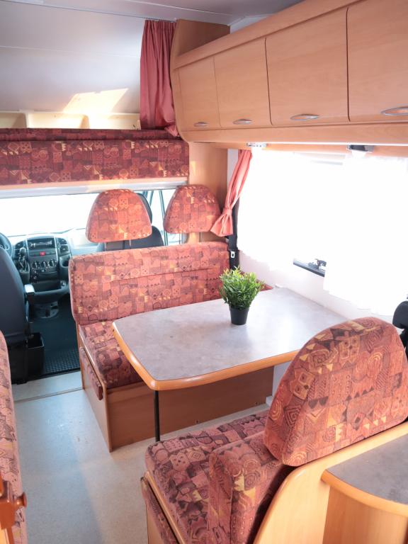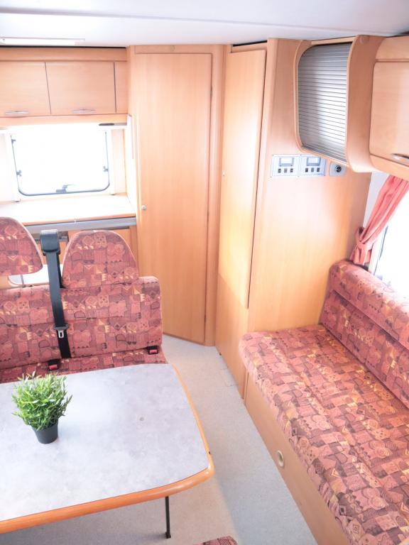 Auton takaosassa keittiö ja pesuhuone, edessä leveä alkovivuode. Auton keskeltä löytyy pöytäryhmä pitkällä sivusohvalla.