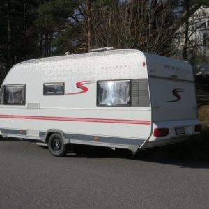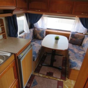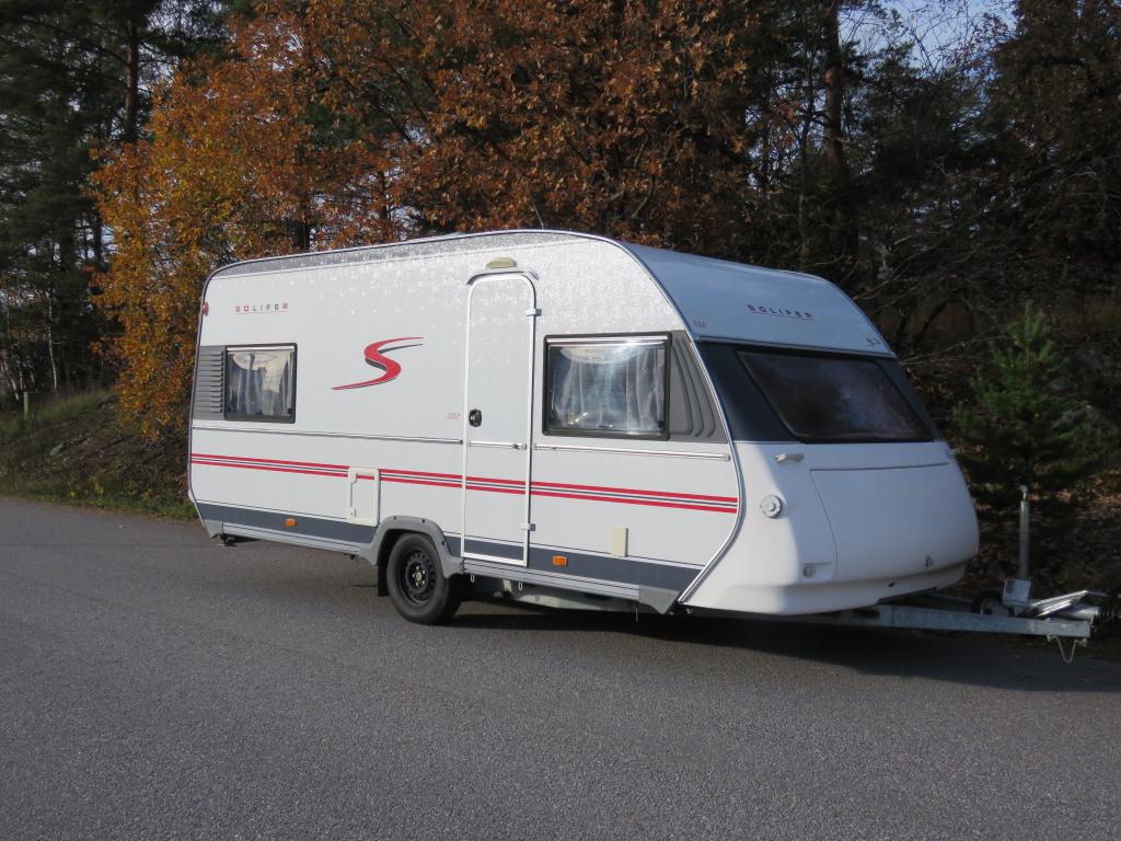Hieno pikku Solikka. Takana vuode-sohva ja päällä taittuva yläkaappi-vuode, keskellä pesuhuone ja keittiö ja edessä istuinryhmä 4:lle. Vesikiertoinen lattialämpö antaa tasaisen lämmön. Kokonaispaino vain 1200kg.