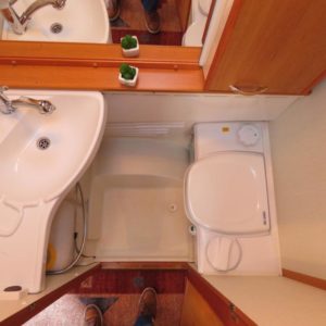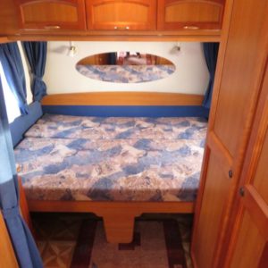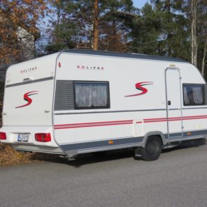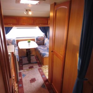 Hieno pikku Solikka. Takana vuode-sohva ja päällä taittuva yläkaappi-vuode, keskellä pesuhuone ja keittiö ja edessä istuinryhmä 4:lle. Vesikiertoinen lattialämpö antaa tasaisen lämmön. Kokonaispaino vain 1200kg.