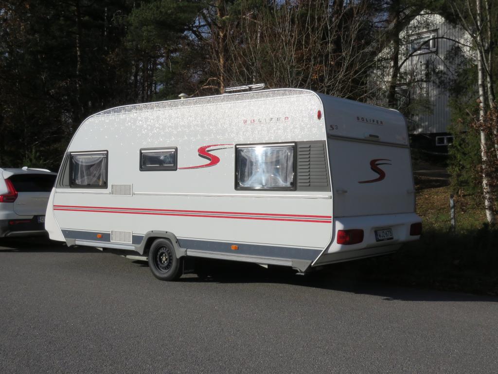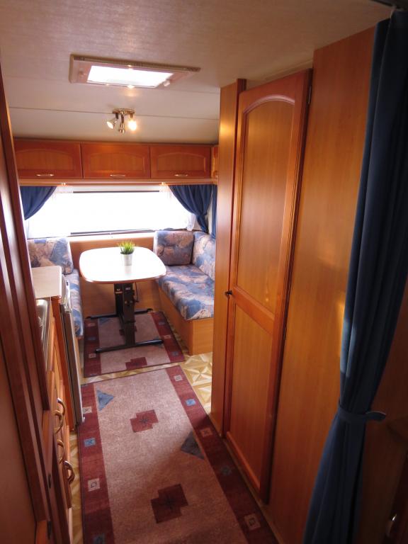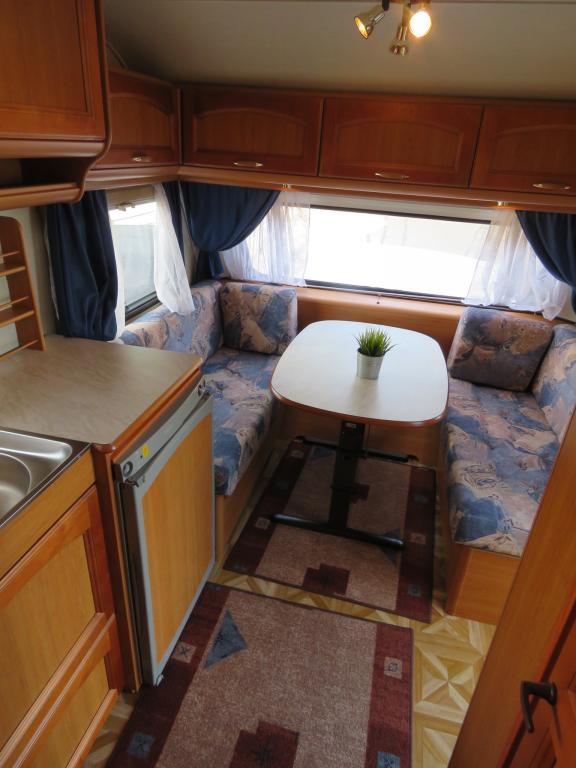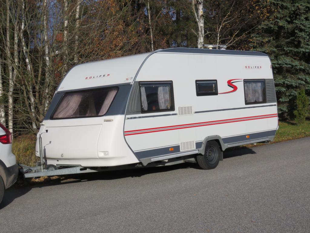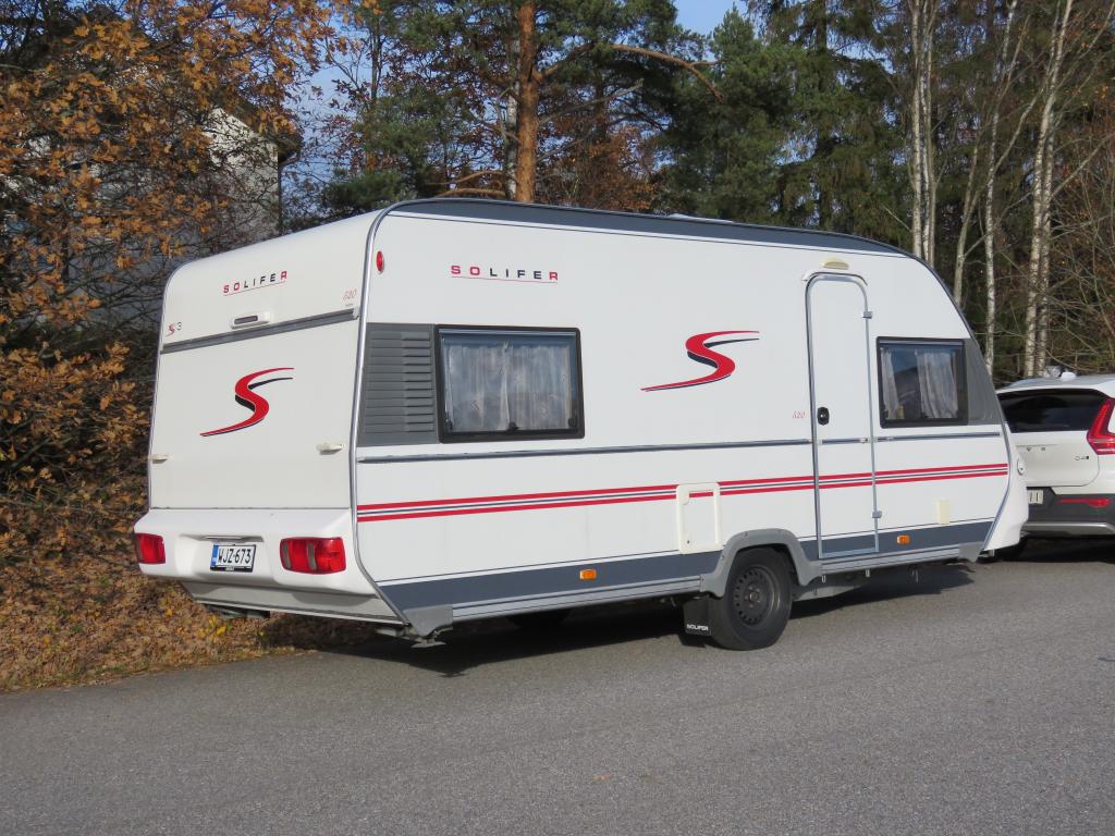 Hieno pikku Solikka. Takana vuode-sohva ja päällä taittuva yläkaappi-vuode, keskellä pesuhuone ja keittiö ja edessä istuinryhmä 4:lle. Vesikiertoinen lattialämpö antaa tasaisen lämmön. Kokonaispaino vain 1200kg.