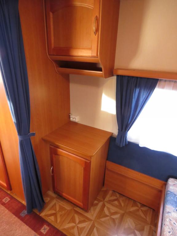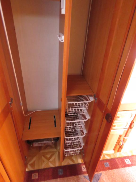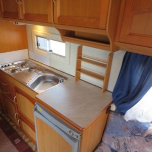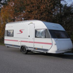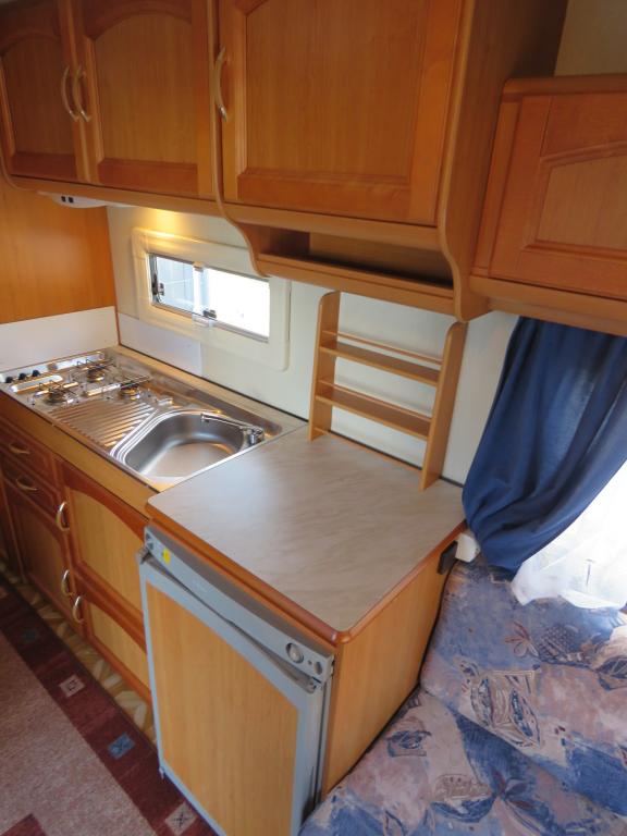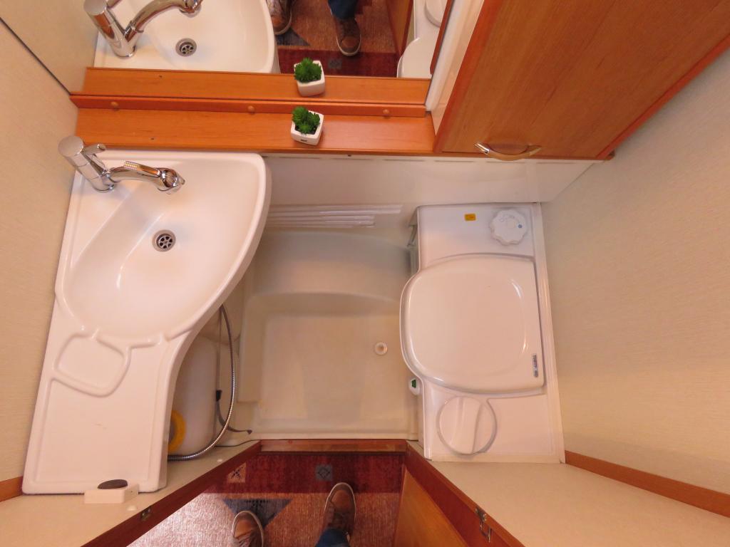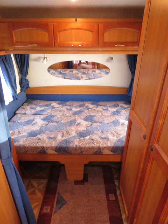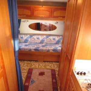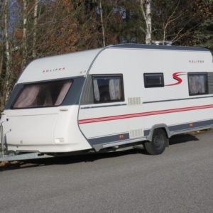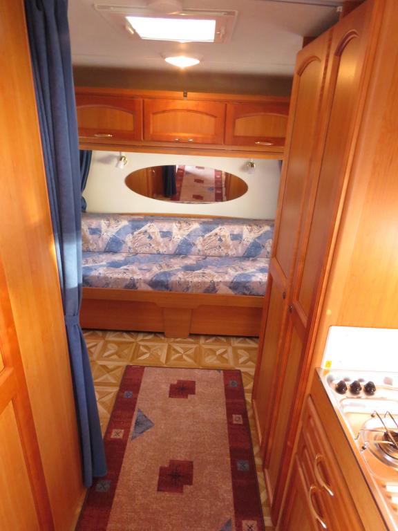 Hieno pikku Solikka. Takana vuode-sohva ja päällä taittuva yläkaappi-vuode, keskellä pesuhuone ja keittiö ja edessä istuinryhmä 4:lle. Vesikiertoinen lattialämpö antaa tasaisen lämmön. Kokonaispaino vain 1200kg.