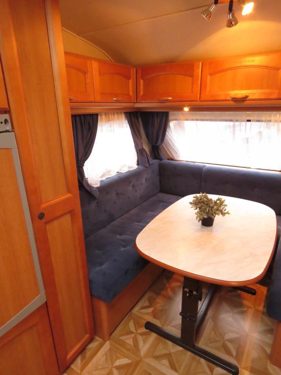 Vaunun takaosassa pitkittäinen parivuode ja pesuhuone, edessä viihtyisä pöytäryhmä. Valoa vaunuun tuo suuri kattoikkuna.