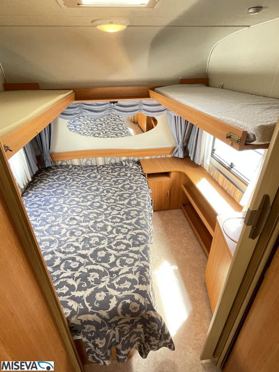 Vaunun takaosassa pitkittäinen parivuode, yläpuolella kaapeista käännettävät lasten vuoteet, keskiosassa keittiö, kaappitilaa ja WC, edessä vastakkainistuttava pöytäryhmä johon saa sijattua leveän parivuoteen.