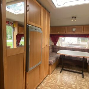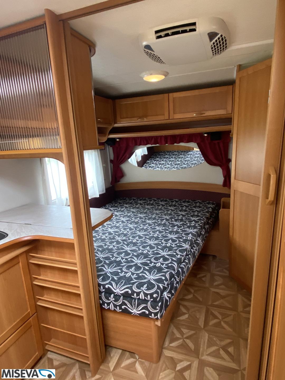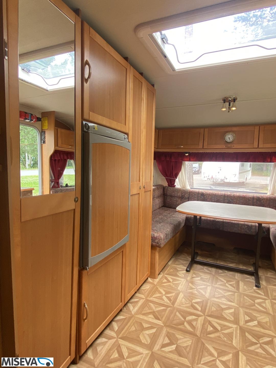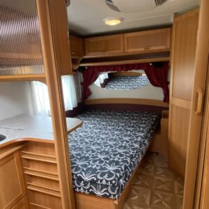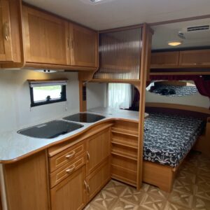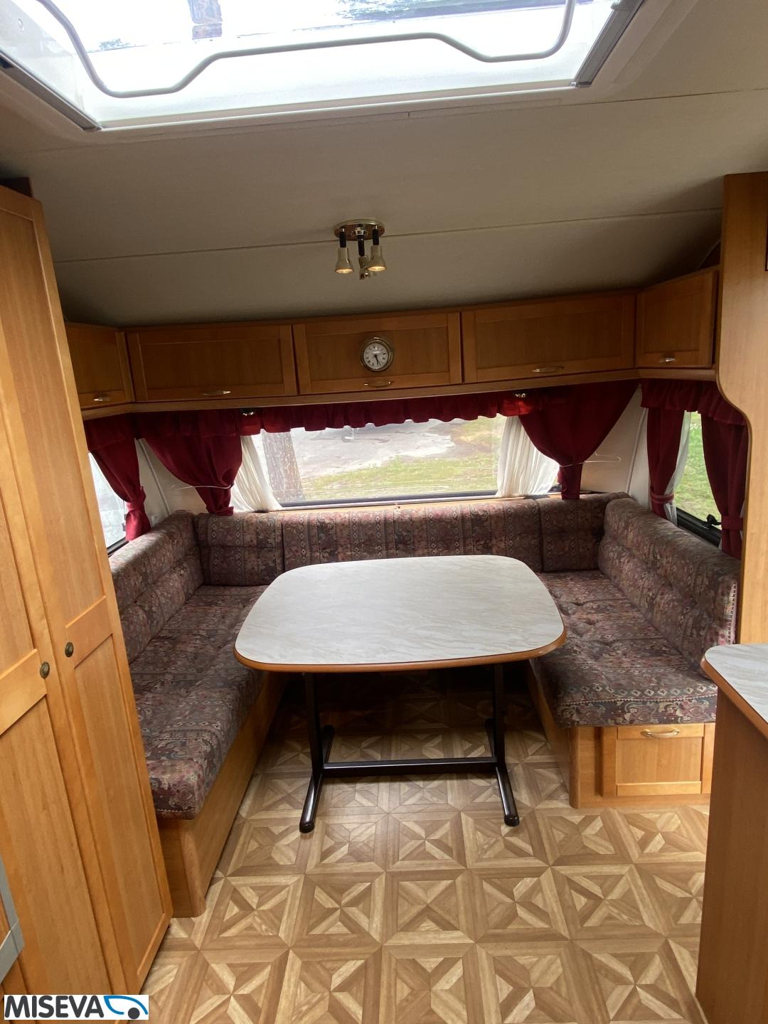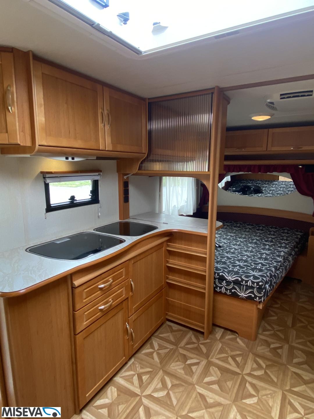 Edessä iso U-ryhmä mistä saa sijattua vuoteet kahdelle. Keskellä keittiö perusvarustuksineen ja paljon säilytystilaa tavaroille. Takana pitkittäinen parivuode sekä WC/kylpyhuoneltilat ja pieni apupöytätila.