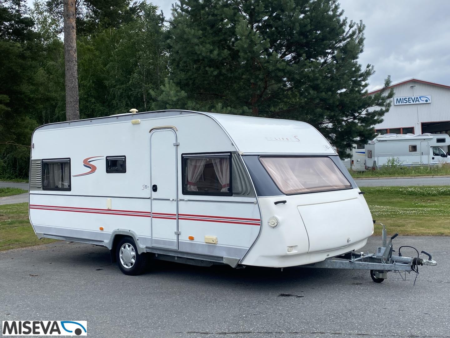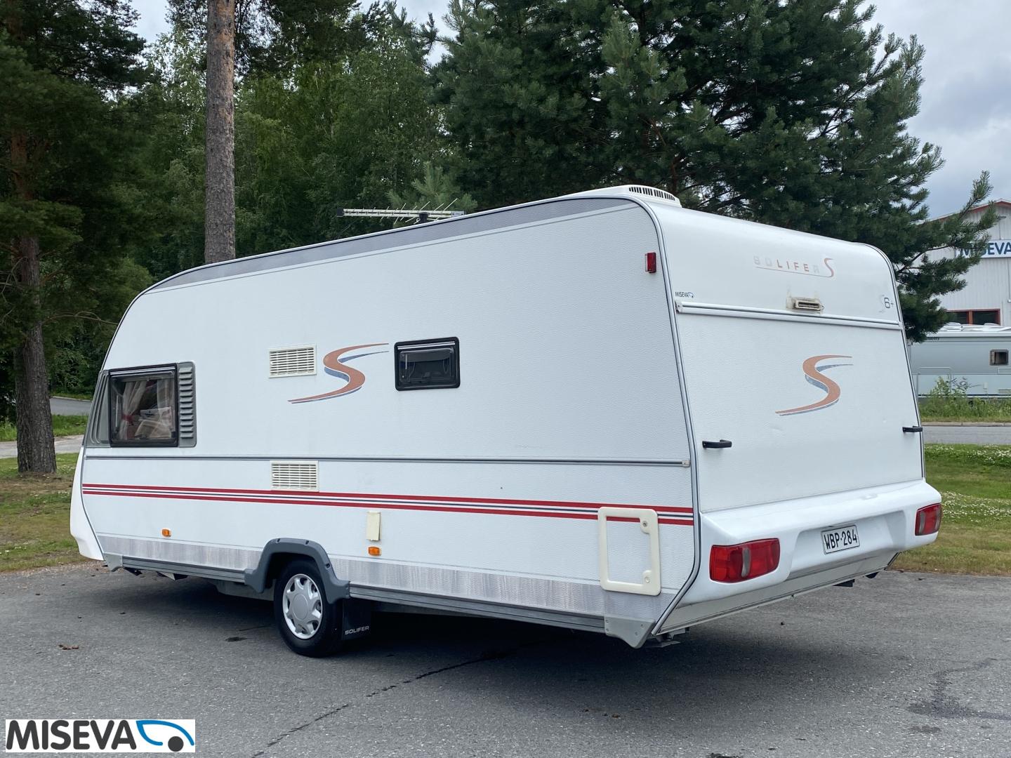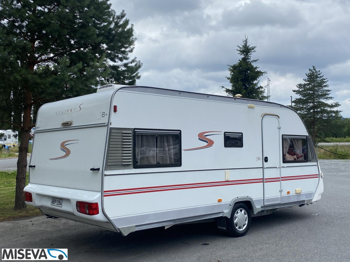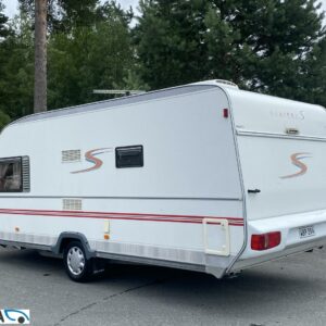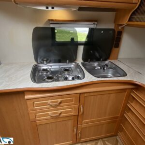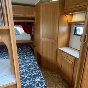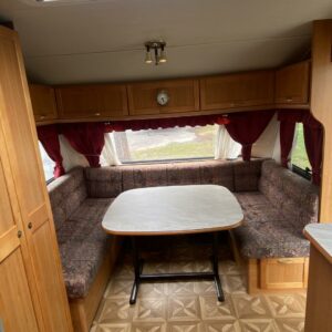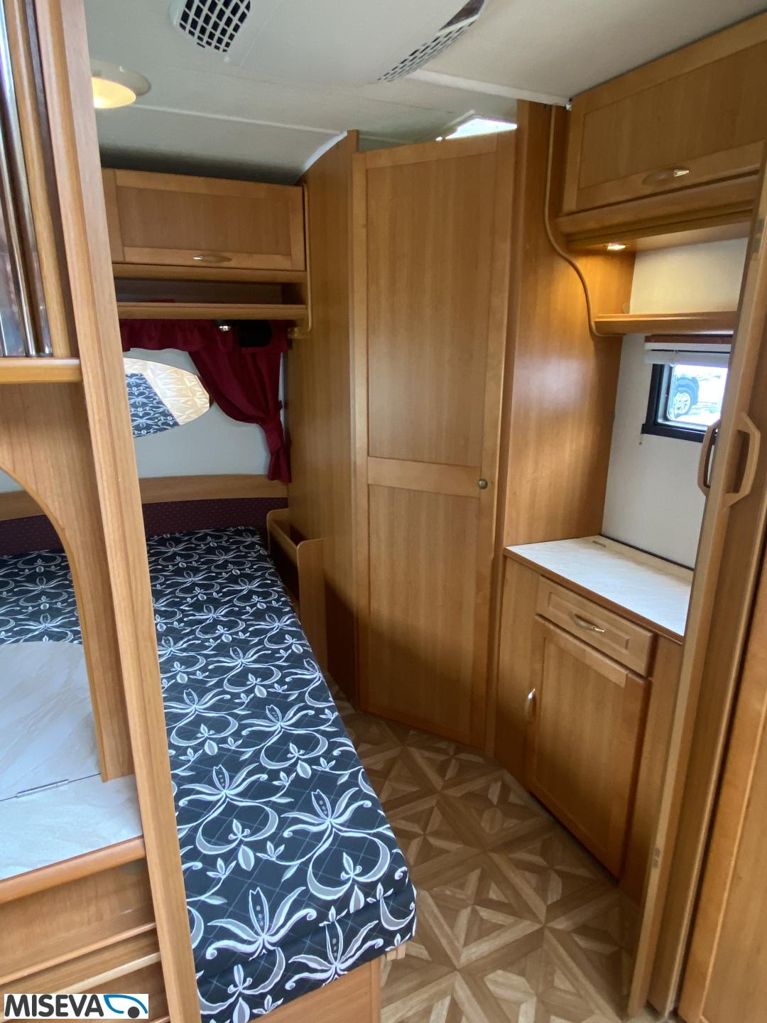 Edessä iso U-ryhmä mistä saa sijattua vuoteet kahdelle. Keskellä keittiö perusvarustuksineen ja paljon säilytystilaa tavaroille. Takana pitkittäinen parivuode sekä WC/kylpyhuoneltilat ja pieni apupöytätila.
