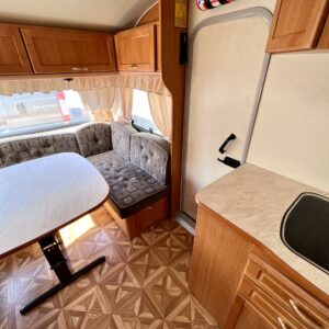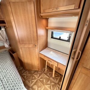 Edessä iso U-ryhmä mistä saa sijattua vuoteet kahdelle. Keskellä keittiö perusvarustuksineen ja paljon säilytystilaa tavaroille. Takana pitkittäinen parivuode sekä WC/kylpyhuonetilat ja pieni apupöytätila.