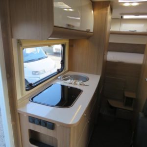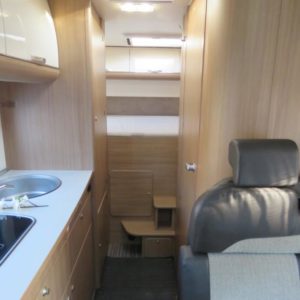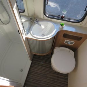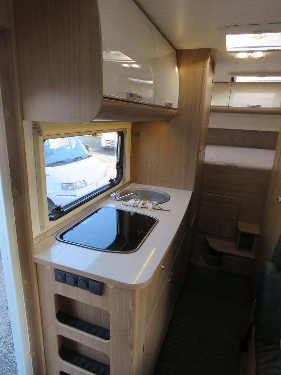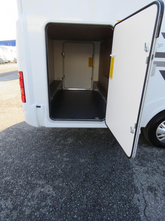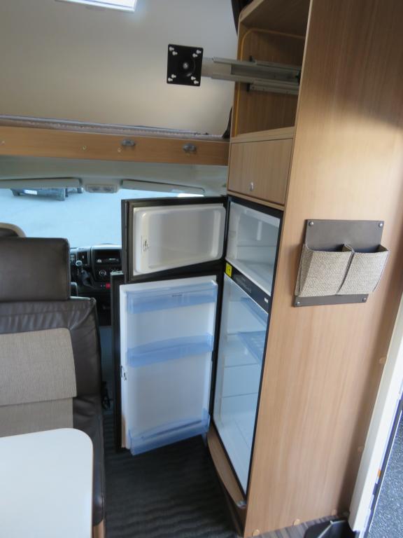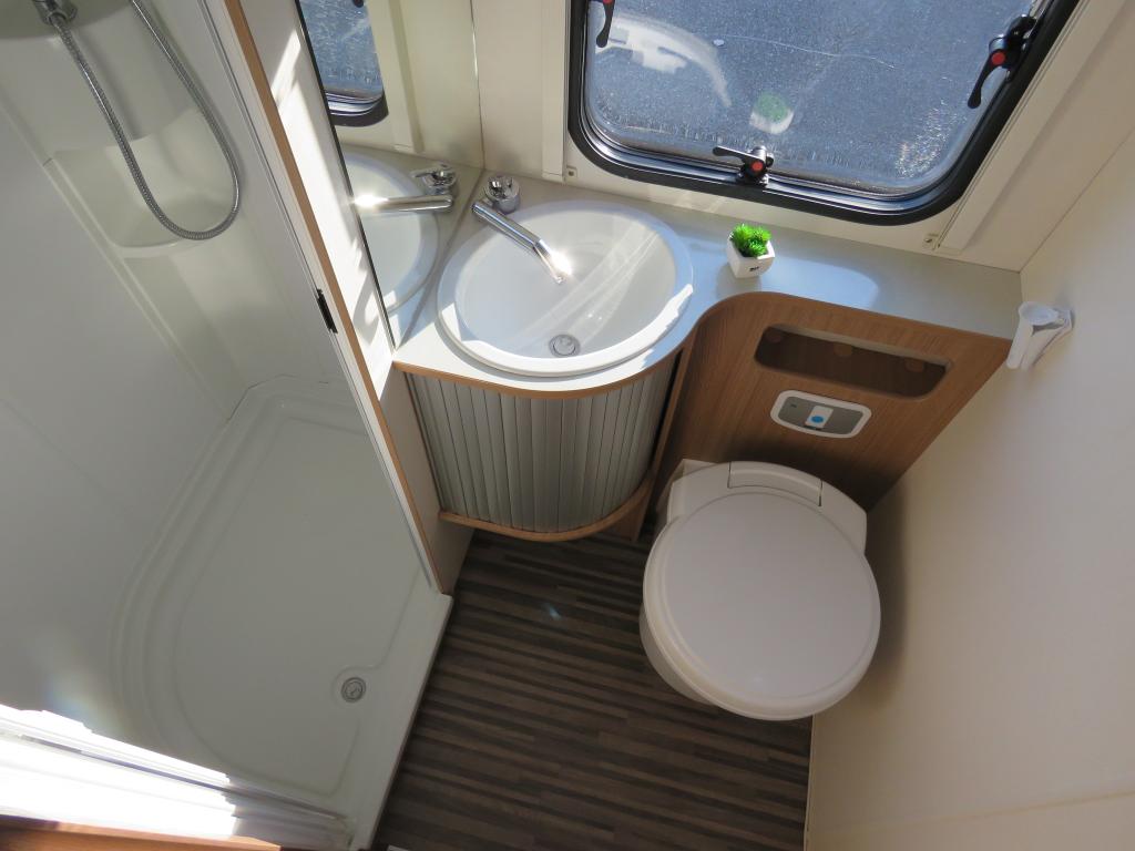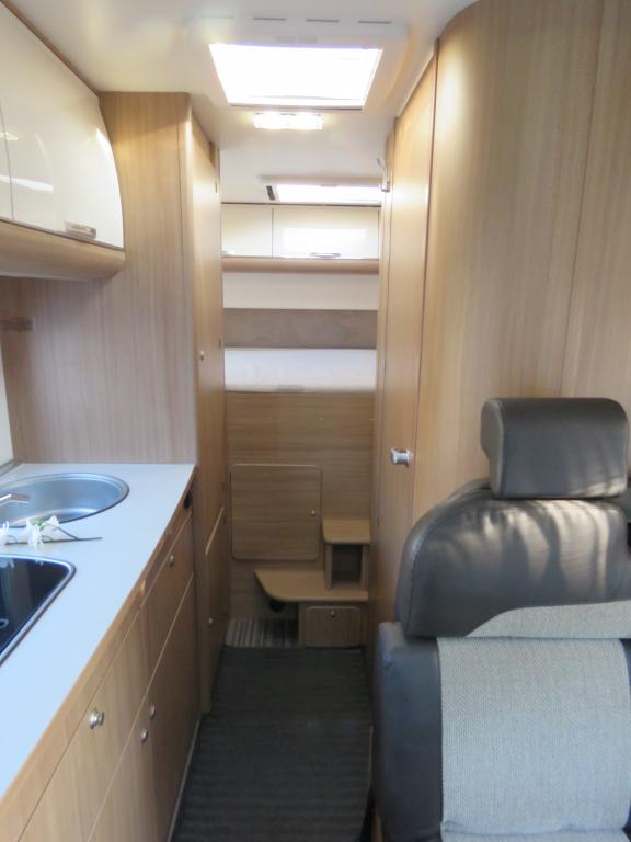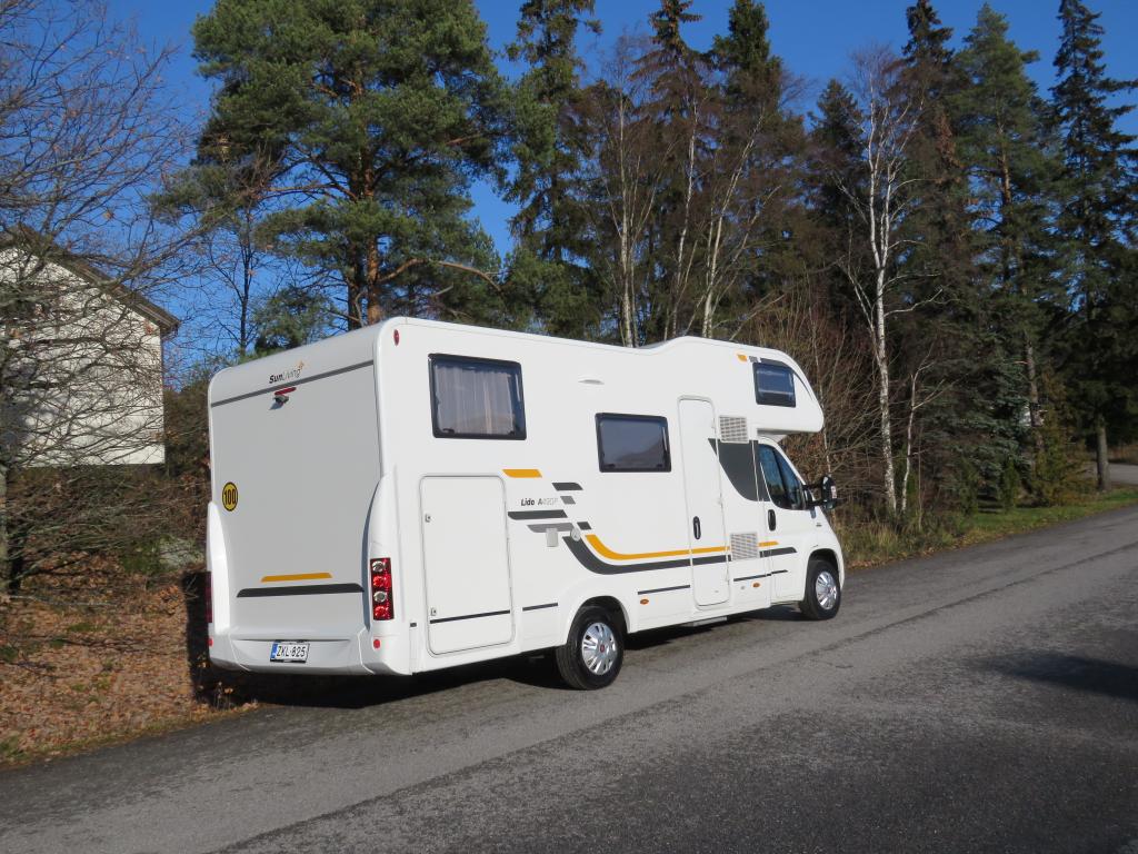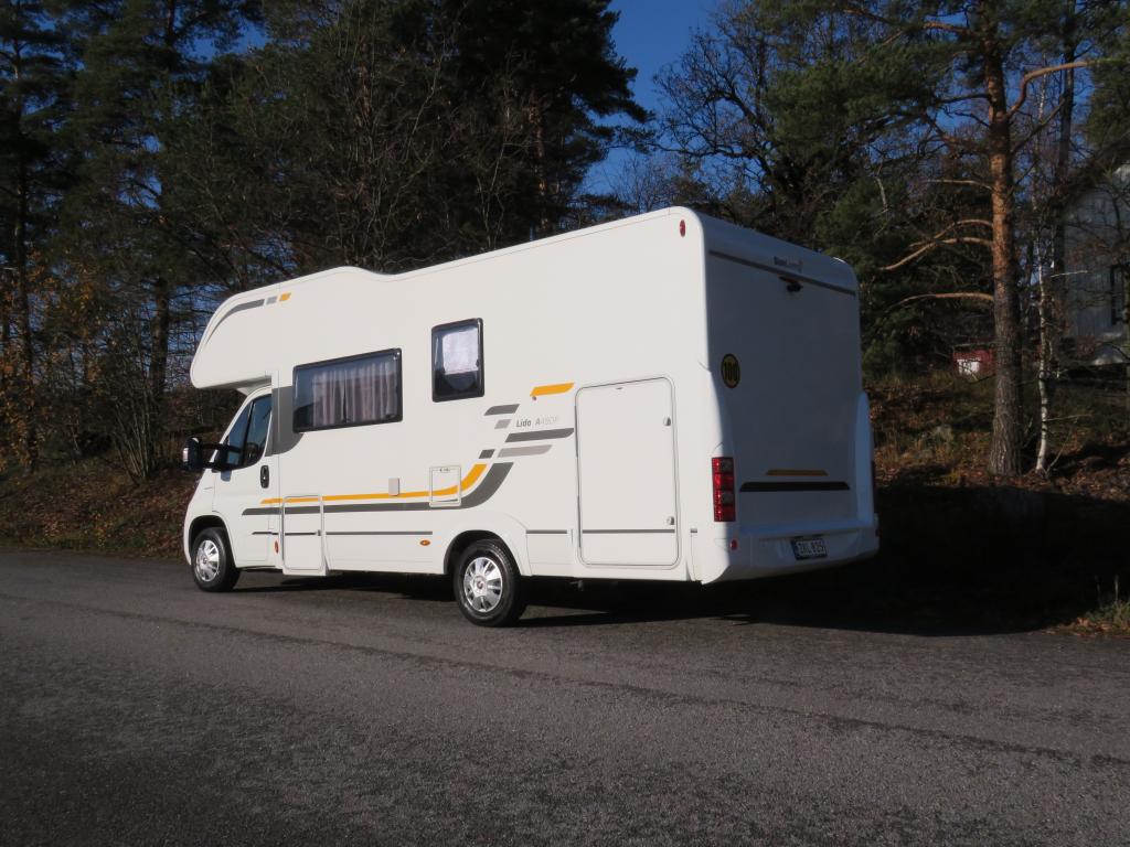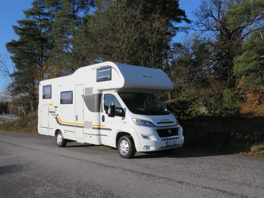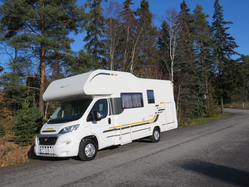 Kuin uusi.1-om. Adrian tuote. Takana parivuode poikittain ja alla iso tallitila molemmanpuolisin luukuin. keskellä tilava pesuhuone erillisellä suihkulla, vastapäätä keittiö ja oven toisella puolella iso jääkaappi-pakastin, olehuoneessa istuinryhmä 4:lle josta pedattaissa parivuode, edessä valoisa alkovi-vuode 2:lle.