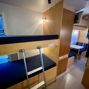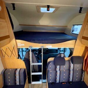 Sisätilat on suunniteltu isommankin perheen tarpeisiin. Alkovin suuri parivuode, kerrosvuoteet sekä pöytäryhmistä muunneltavat lisävuoteet tarjoavat reilusti nukkumapaikkoja ja hyvät yöunet. Takaosan WC ja suihkutila tuovat omaa rauhaa ja helppoutta reissuun.