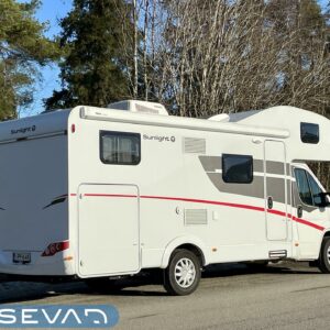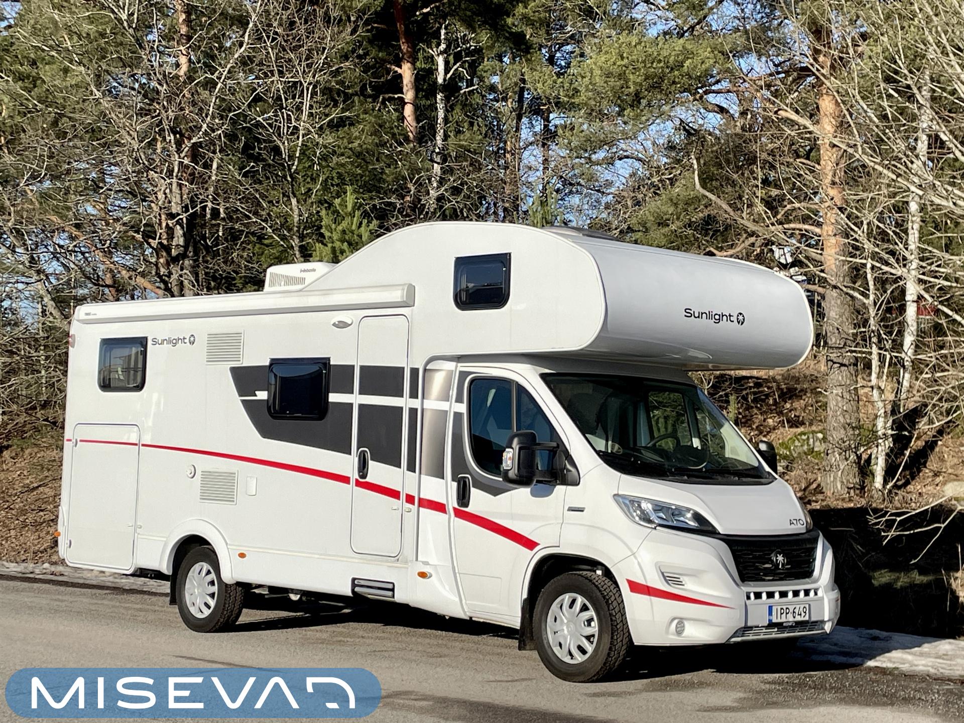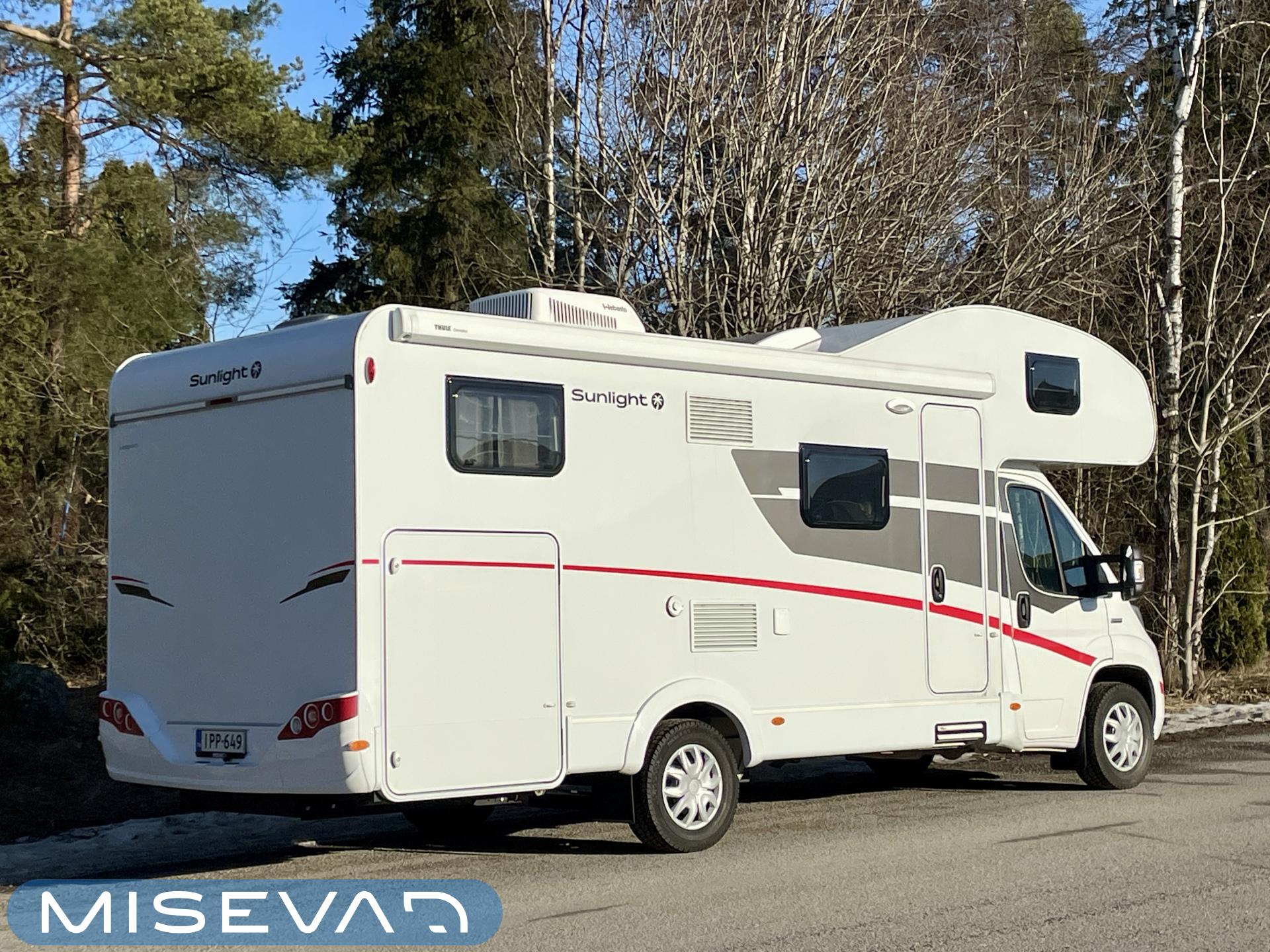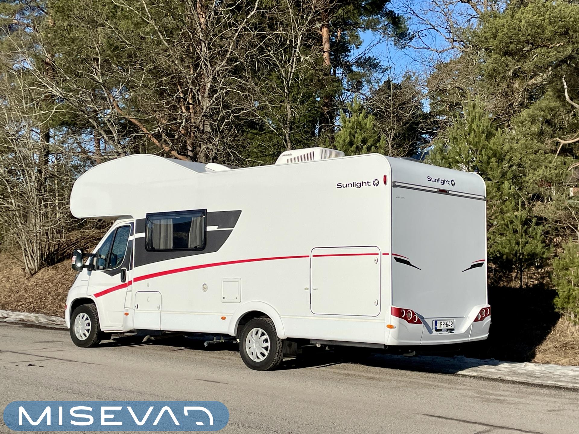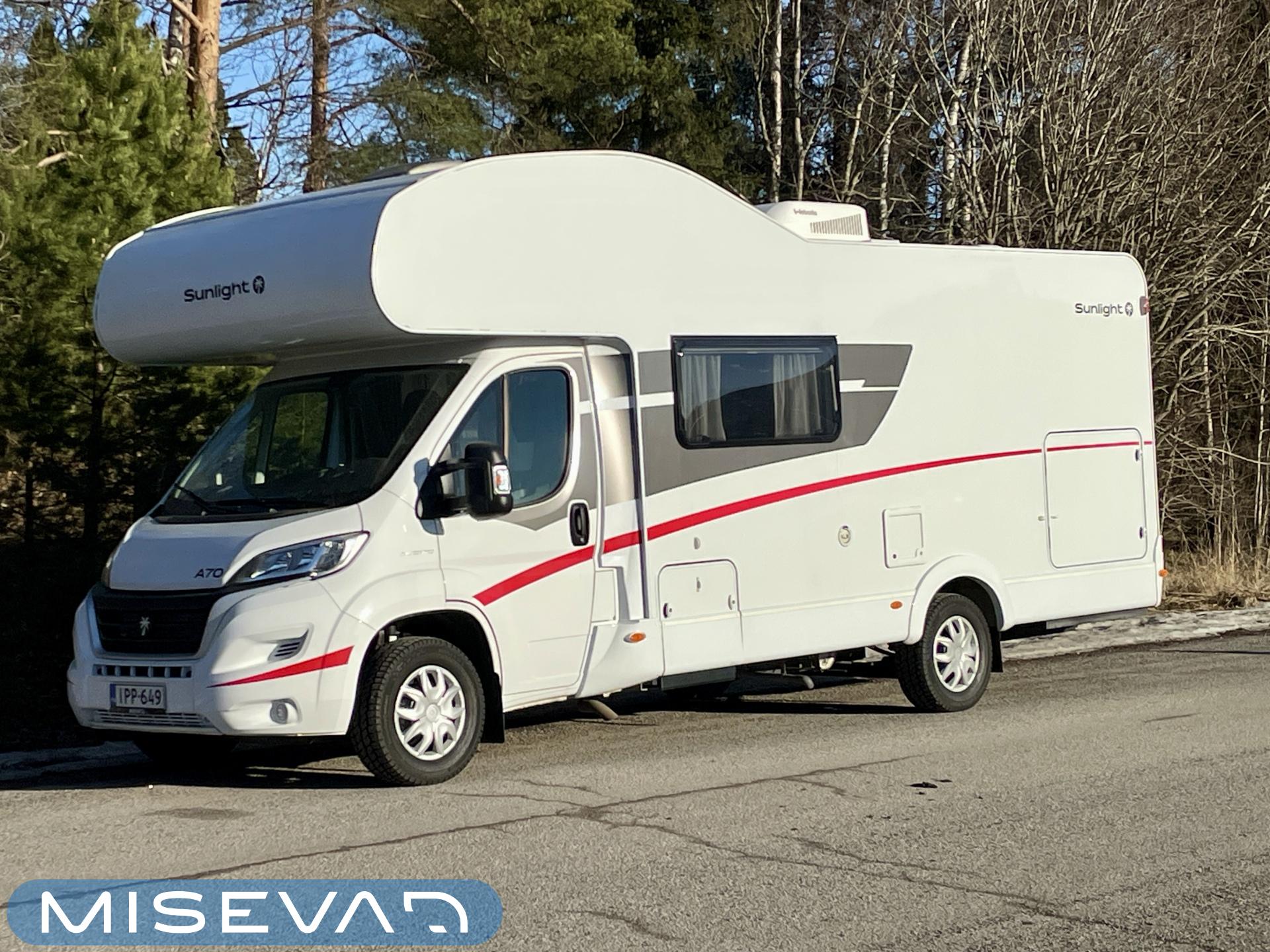 Vähän ajettu ja erinomaisessa kunnossa oleva Sunlight A70 tarjoaa loistavan yhdistelmän mukavuutta, tilaa ja kattavaa varustelua. Autossa on reilusti nukkumapaikkoja koko perheelle. Poikittainen parivuode takana ja iso alkovi parivuode edessä. Pöytäryhmästä teet vielä parisängyn tarvittaessa. Valoisa ja moderni sisustus sekä kaikki tarvittava vaivattomiin reissuihin.Täydellinen matkakumppani isommalle porukalle. Tässä autossa on aina sopivan lämmin tai tarvittaessa viileä, siitä pitää huolen Truma, ylimääräisenä asennettuna polttoainelämmitin asuintilassa, sähköinen lattialämmitys, sekä viilennykseen puolestaan asuintilan ilmastointi, sekä ohjaamon ilmastointi.