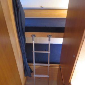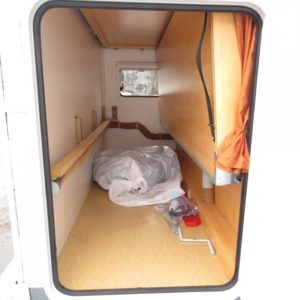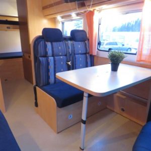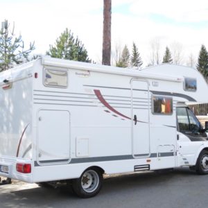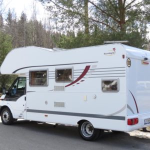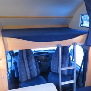 Istuma- ja makuupaikat 4:lle. Auton takaosassa kerrossängyt, edessä leveä alkoviparivuode.