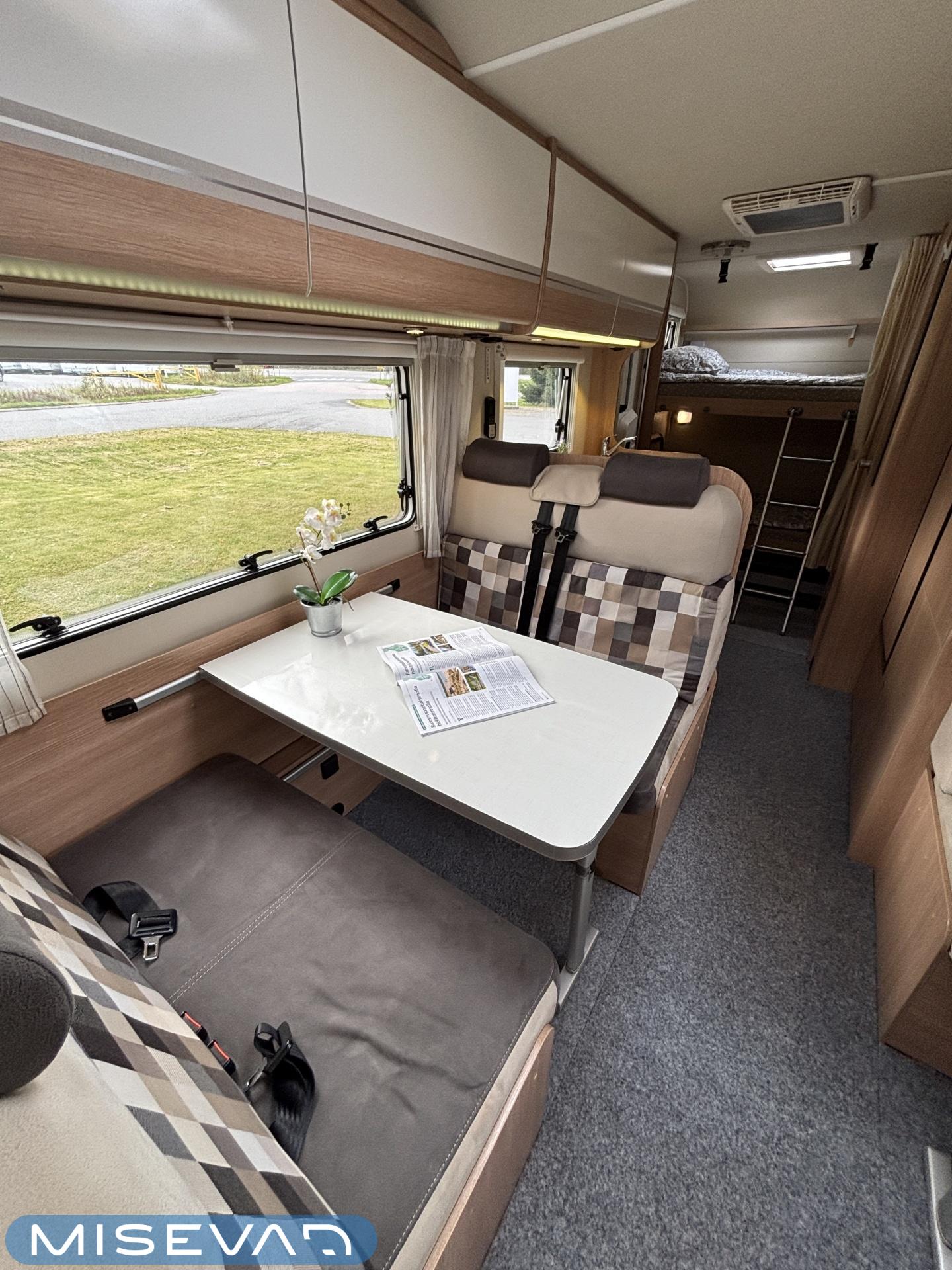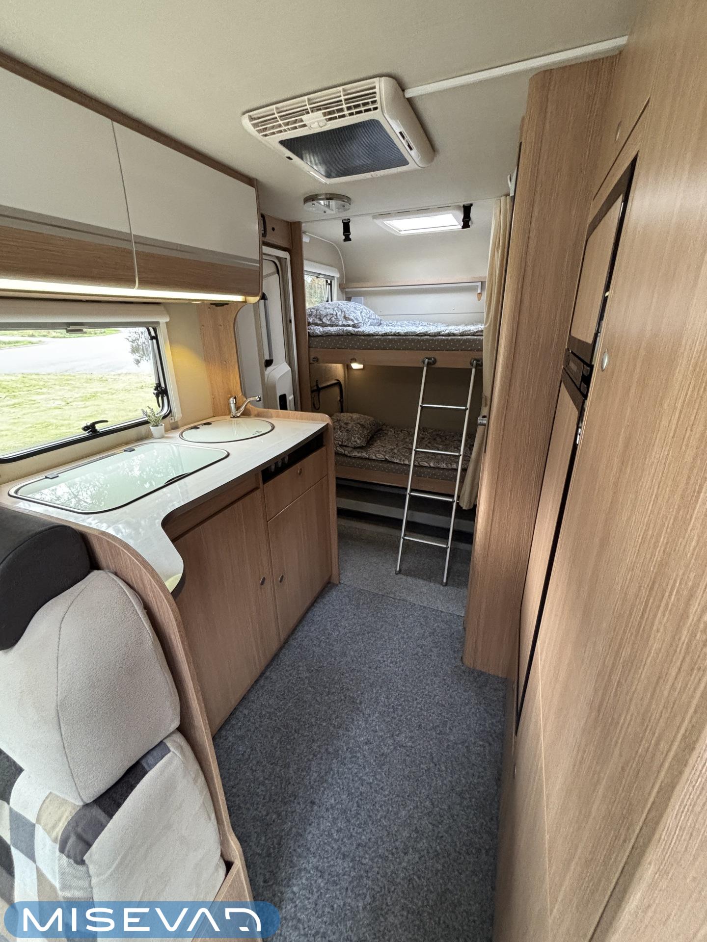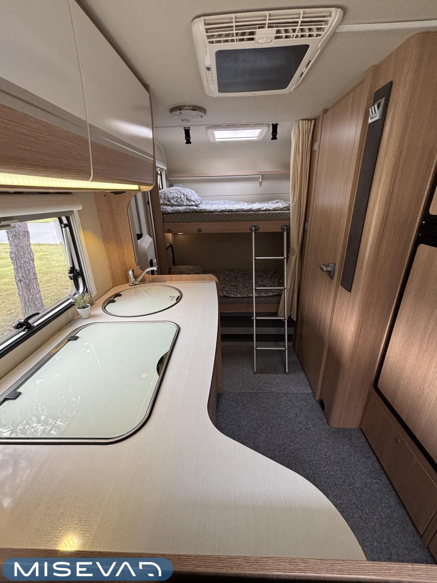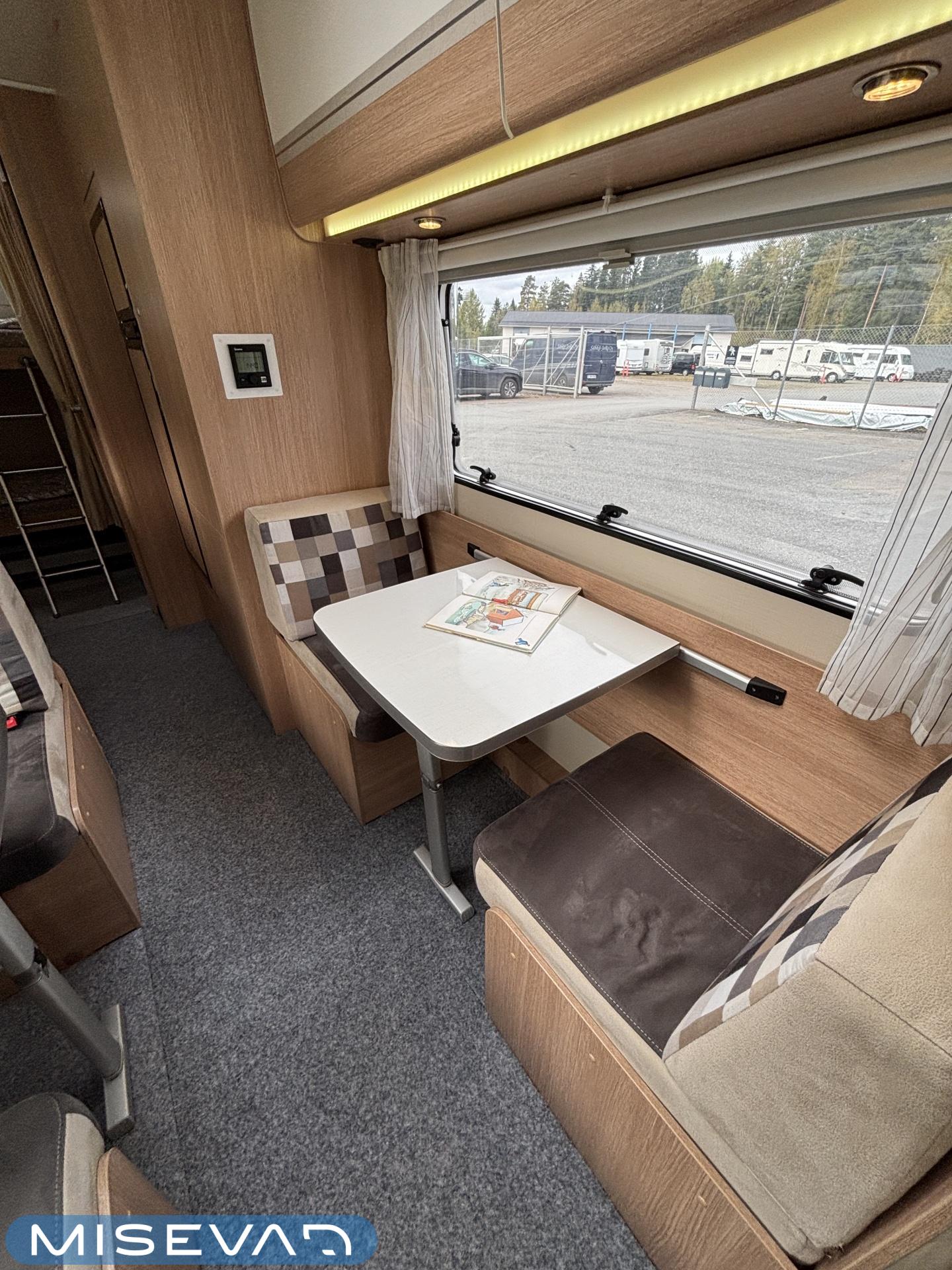 Nyt on tilaa temmeltää! Tämä todellinen perhevankkuri kerrosvuoteilla ja kahdella pöytäryhmällä tarjoaa vuodepaikat jopa seitsemälle yöpyjälle (rek. matkustuspaikat kuudelle). Ohjaamon päällä olevassa alkovissa köllöttelee mukavasti kaksi henkilöä. 2+2 ja 1+1 pöytäryhmistä saadaan tarvittaessa sijattua vuoteet kolmelle henkilölle. Ja loput kaksi makoilee taakse poikittain sijoitetuissa kerrosvuoteissa. Kerrosvuoteista alemman saa nostettua ylös, jolloin tarjolla on ”takatalli” säilytystilaa tavaroille. Tietysti tästä löytyy vielä keittiö, sekä WC/kylppäritilat. Lämmitysjärjestelmänä toimii Trumaticin tehokkain (6kw) ilmakeskuslämmitys sähkövastuksilla marinoituna. Autossa on oikein mallikas varustelu jo valmiiksi asennettuna. Ilmastointi on ohjaamossa, sekä asuintilassa ja ohjaamon varusteissa myös vakionopeuden säädin ja peruutuskamera. Pihapuolen varusteluista mainittakkoon markiisi, vetokoukku ja pyöräteline. Aika nätti kokonaisuus kyseessä.