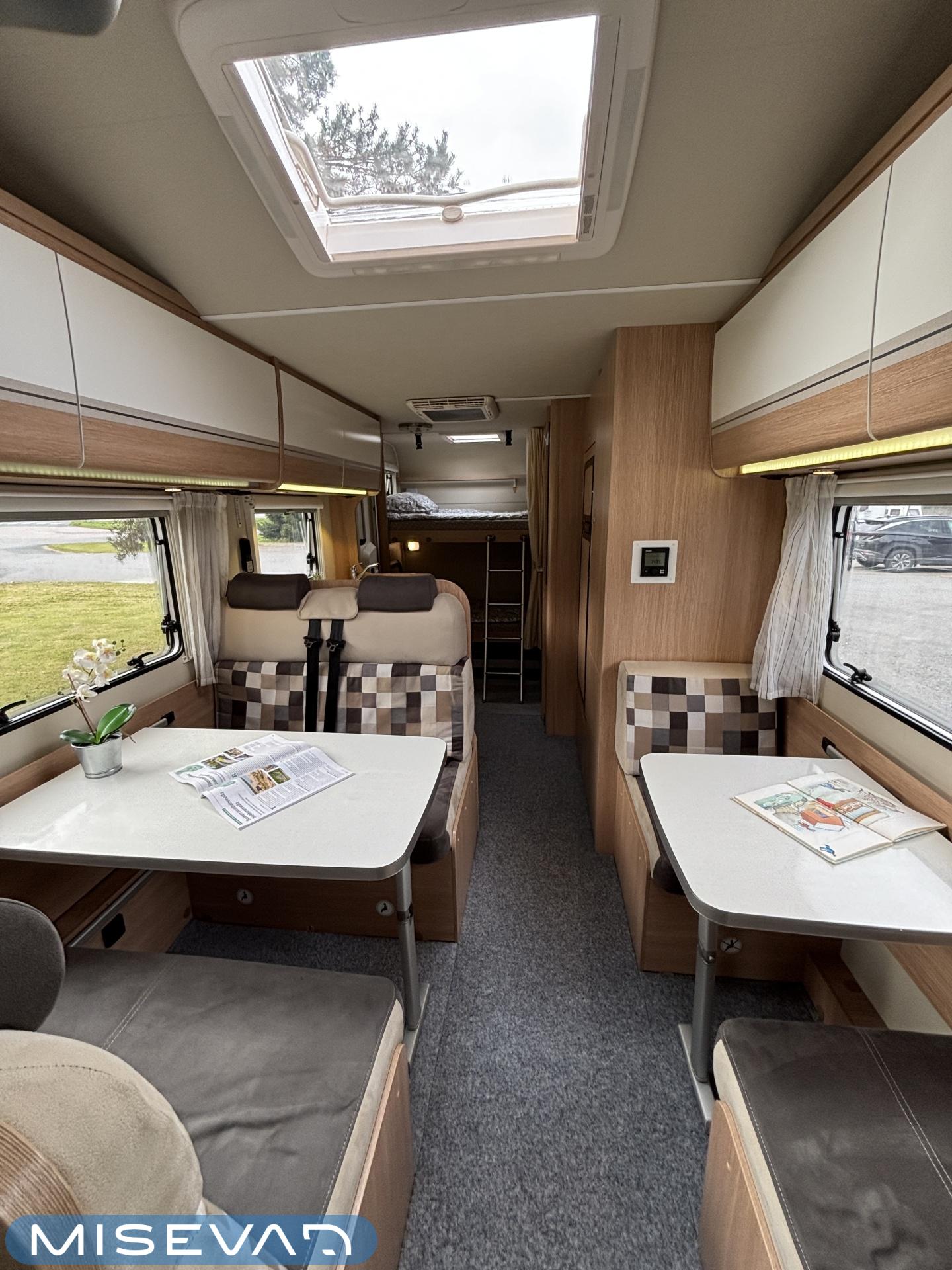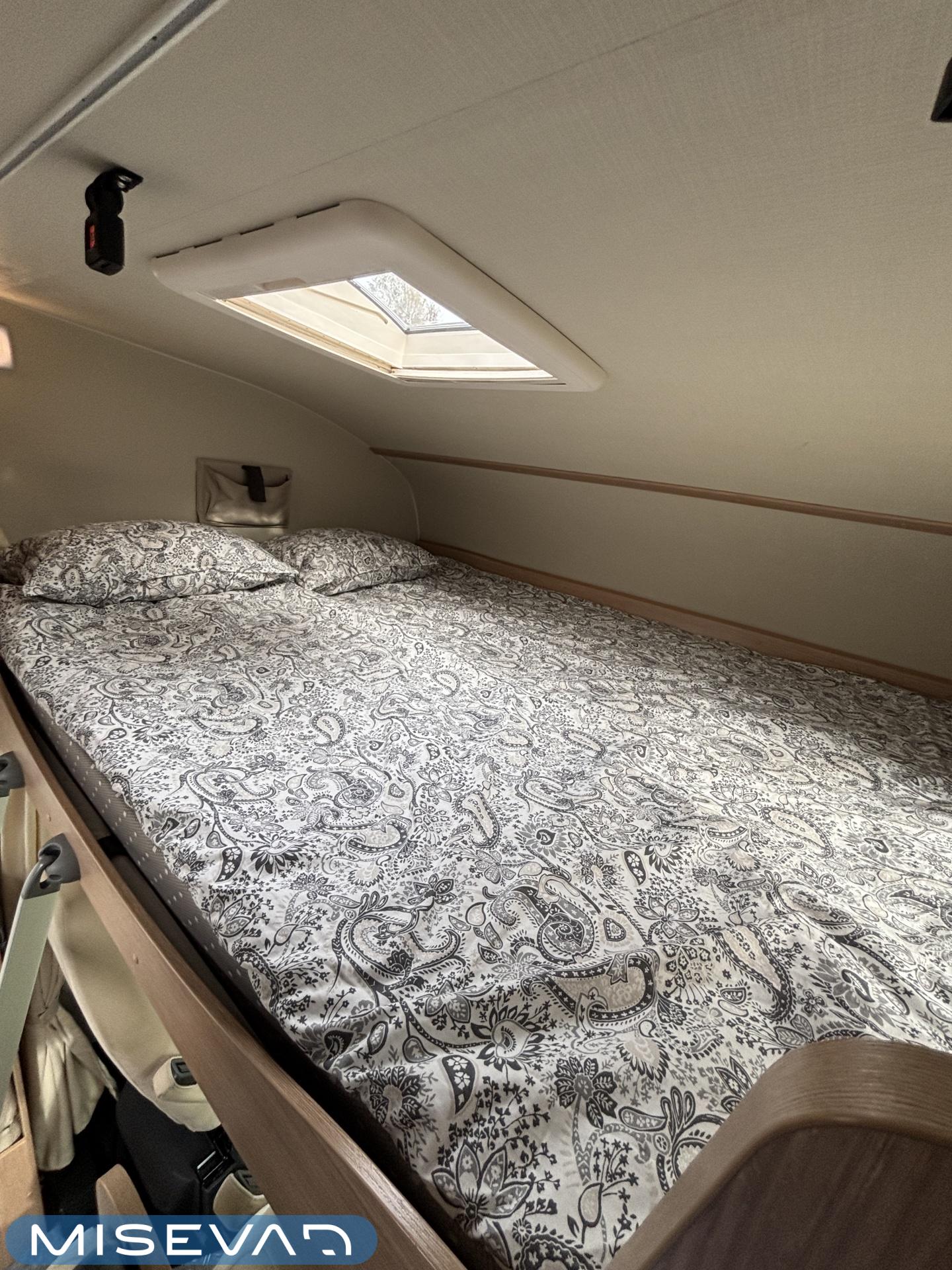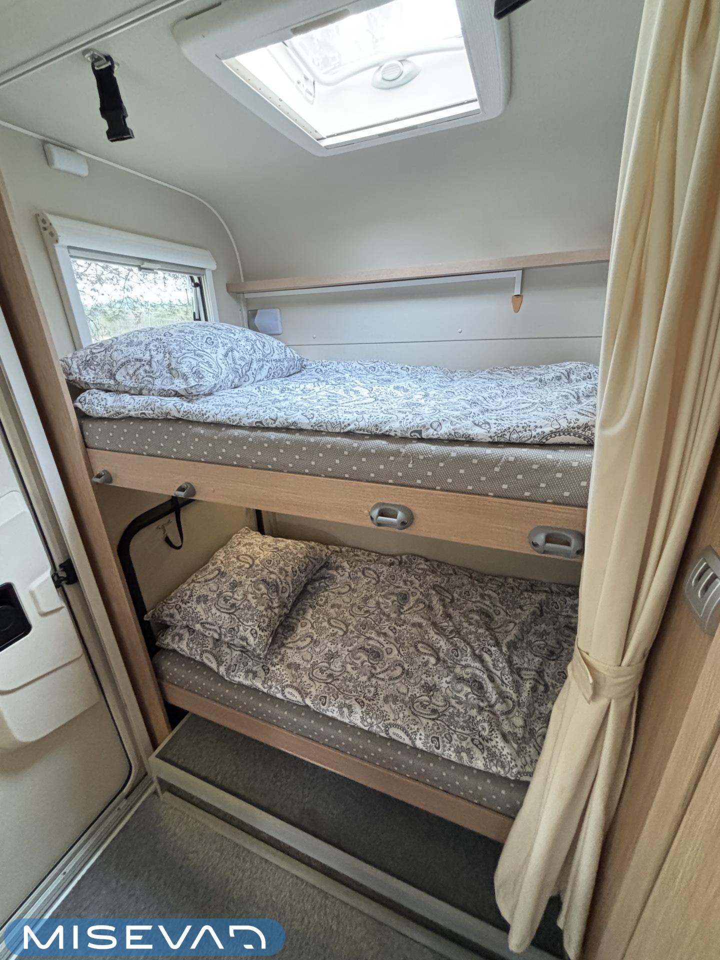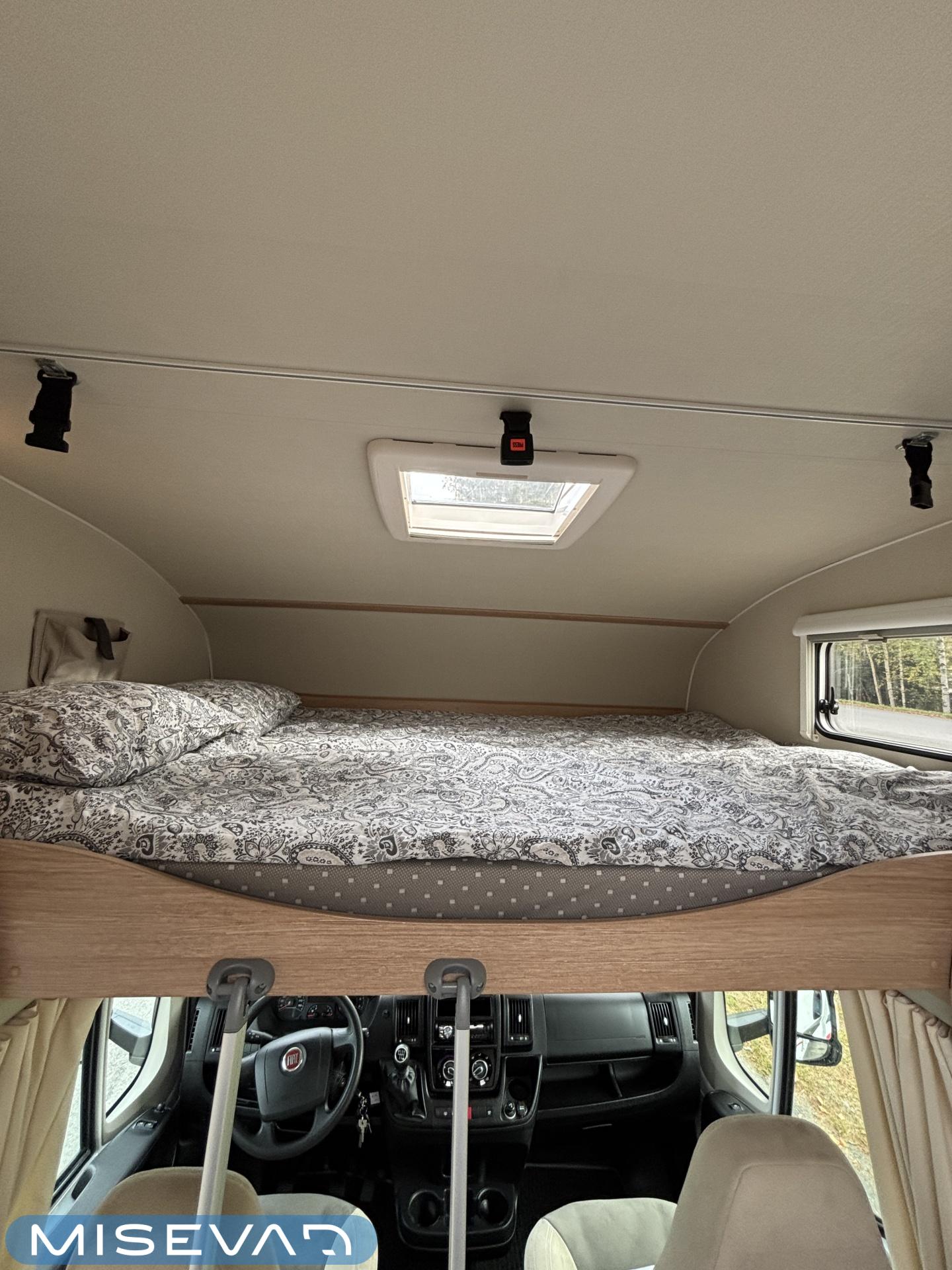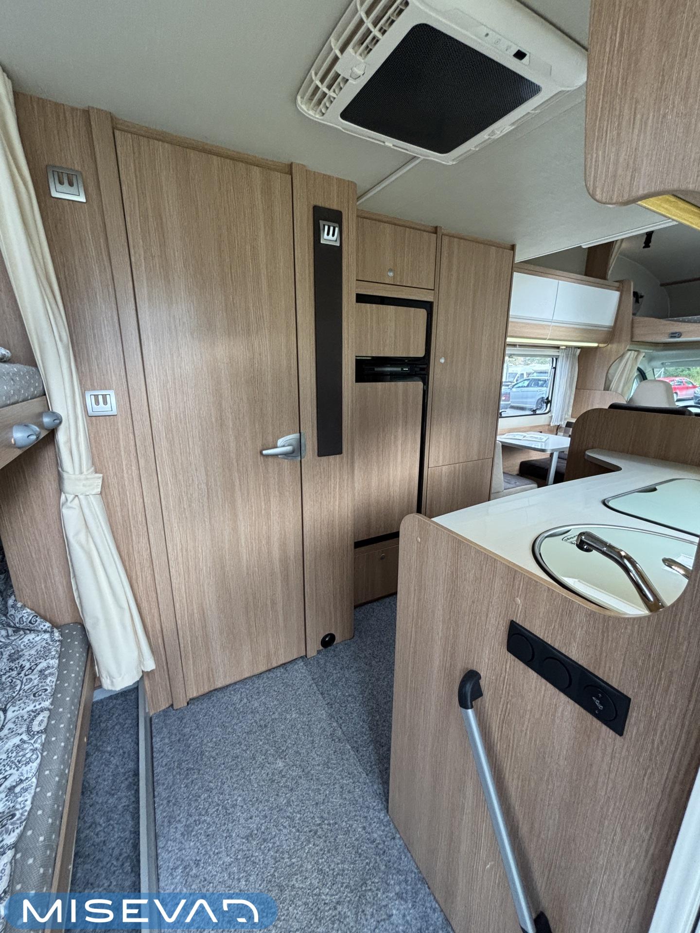 Nyt on tilaa temmeltää! Tämä todellinen perhevankkuri kerrosvuoteilla ja kahdella pöytäryhmällä tarjoaa vuodepaikat jopa seitsemälle yöpyjälle (rek. matkustuspaikat kuudelle). Ohjaamon päällä olevassa alkovissa köllöttelee mukavasti kaksi henkilöä. 2+2 ja 1+1 pöytäryhmistä saadaan tarvittaessa sijattua vuoteet kolmelle henkilölle. Ja loput kaksi makoilee taakse poikittain sijoitetuissa kerrosvuoteissa. Kerrosvuoteista alemman saa nostettua ylös, jolloin tarjolla on ”takatalli” säilytystilaa tavaroille. Tietysti tästä löytyy vielä keittiö, sekä WC/kylppäritilat. Lämmitysjärjestelmänä toimii Trumaticin tehokkain (6kw) ilmakeskuslämmitys sähkövastuksilla marinoituna. Autossa on oikein mallikas varustelu jo valmiiksi asennettuna. Ilmastointi on ohjaamossa, sekä asuintilassa ja ohjaamon varusteissa myös vakionopeuden säädin ja peruutuskamera. Pihapuolen varusteluista mainittakkoon markiisi, vetokoukku ja pyöräteline. Aika nätti kokonaisuus kyseessä.