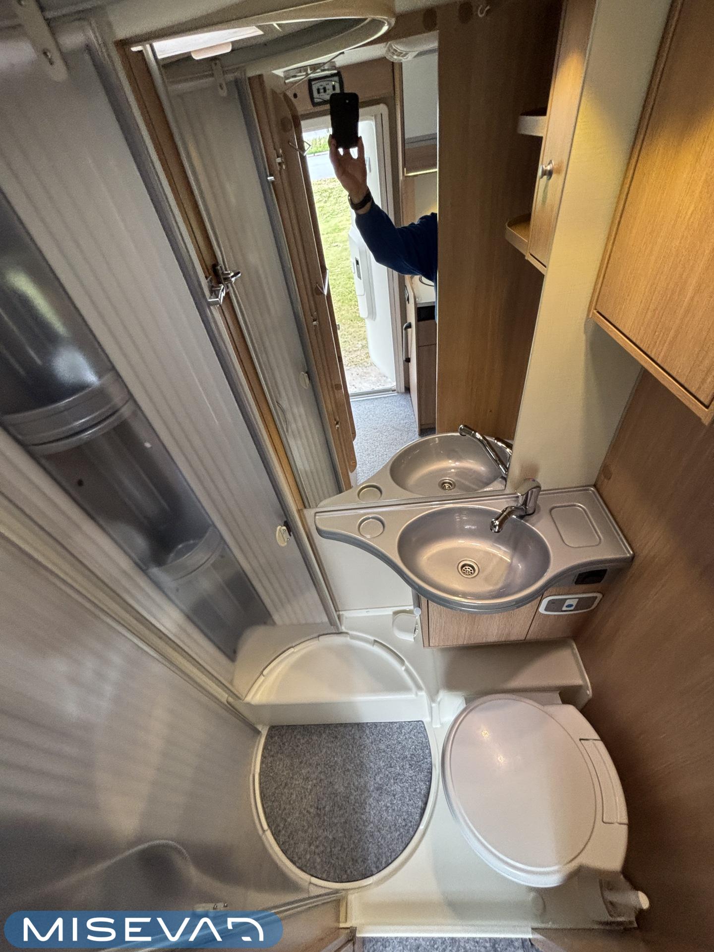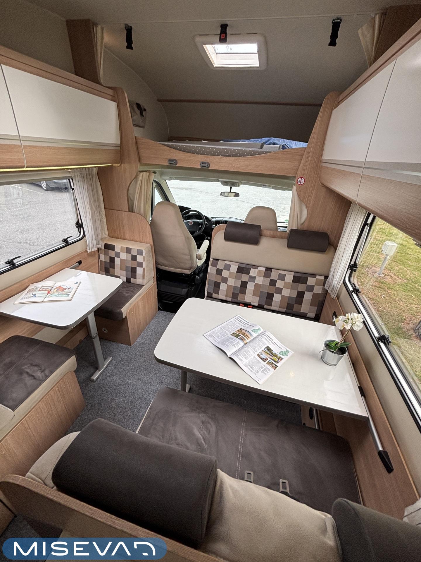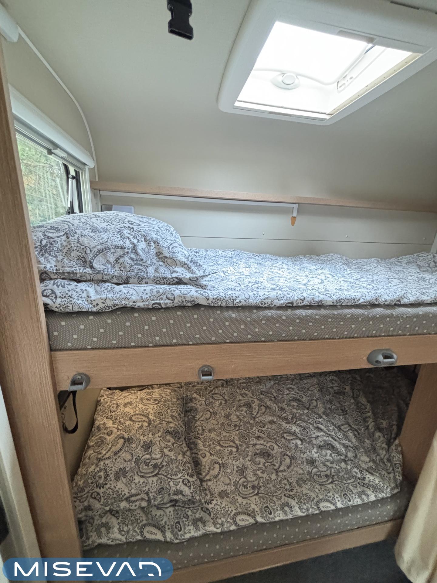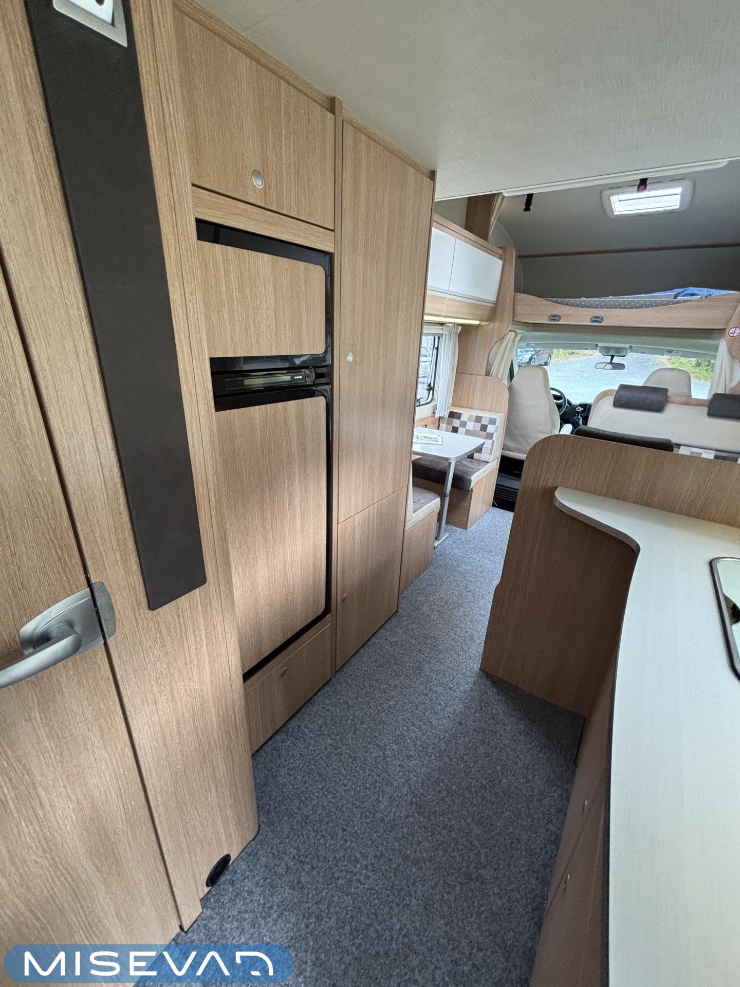 Nyt on tilaa temmeltää! Tämä todellinen perhevankkuri kerrosvuoteilla ja kahdella pöytäryhmällä tarjoaa vuodepaikat jopa seitsemälle yöpyjälle (rek. matkustuspaikat kuudelle). Ohjaamon päällä olevassa alkovissa köllöttelee mukavasti kaksi henkilöä. 2+2 ja 1+1 pöytäryhmistä saadaan tarvittaessa sijattua vuoteet kolmelle henkilölle. Ja loput kaksi makoilee taakse poikittain sijoitetuissa kerrosvuoteissa. Kerrosvuoteista alemman saa nostettua ylös, jolloin tarjolla on ”takatalli” säilytystilaa tavaroille. Tietysti tästä löytyy vielä keittiö, sekä WC/kylppäritilat. Lämmitysjärjestelmänä toimii Trumaticin tehokkain (6kw) ilmakeskuslämmitys sähkövastuksilla marinoituna. Autossa on oikein mallikas varustelu jo valmiiksi asennettuna. Ilmastointi on ohjaamossa, sekä asuintilassa ja ohjaamon varusteissa myös vakionopeuden säädin ja peruutuskamera. Pihapuolen varusteluista mainittakkoon markiisi, vetokoukku ja pyöräteline. Aika nätti kokonaisuus kyseessä.