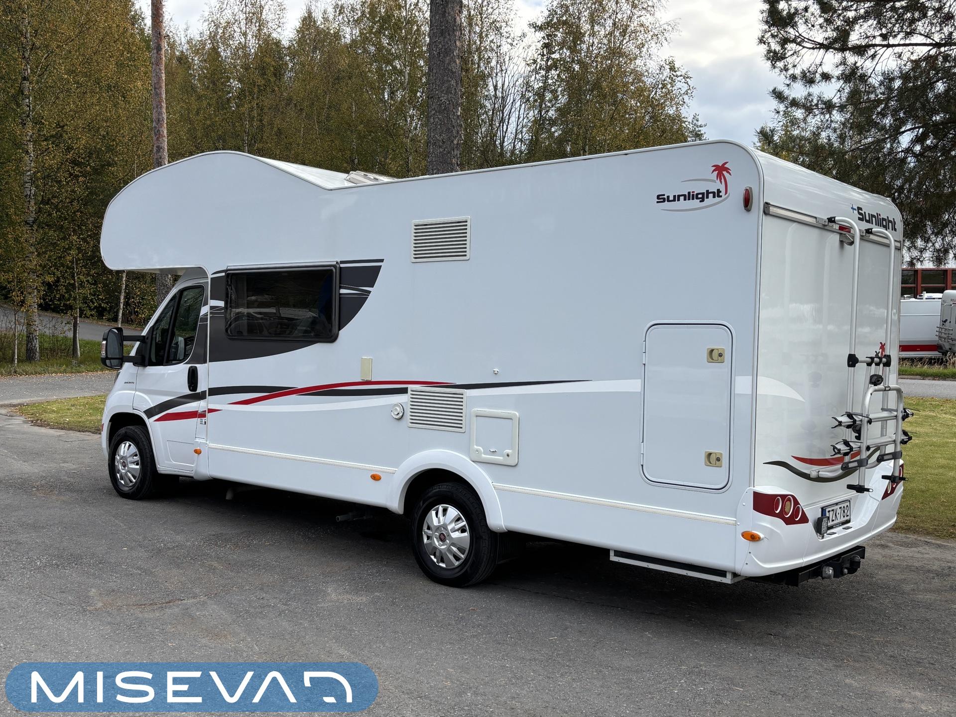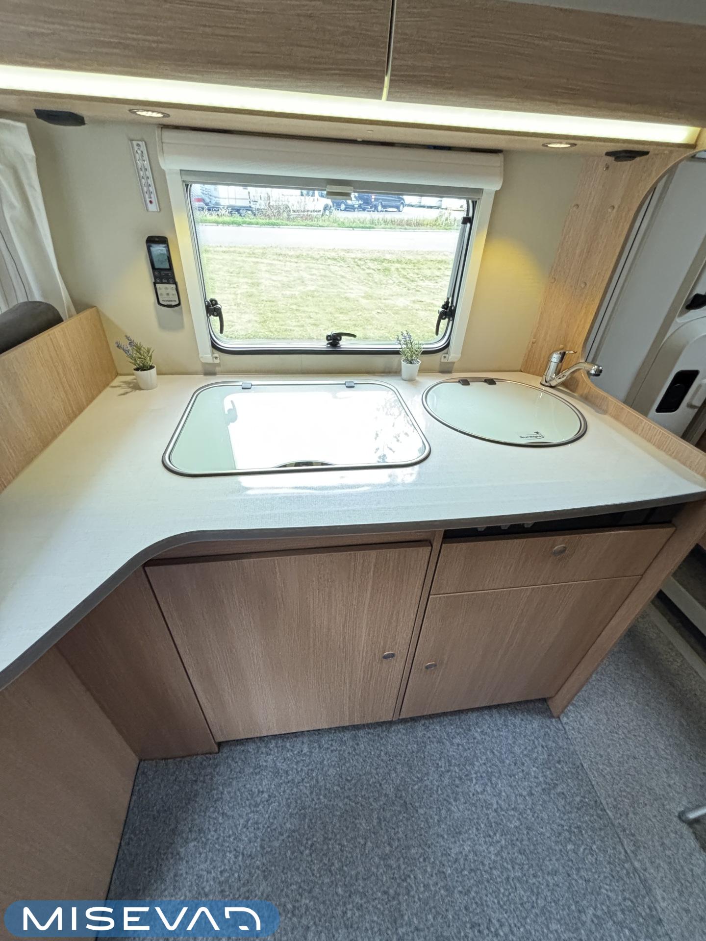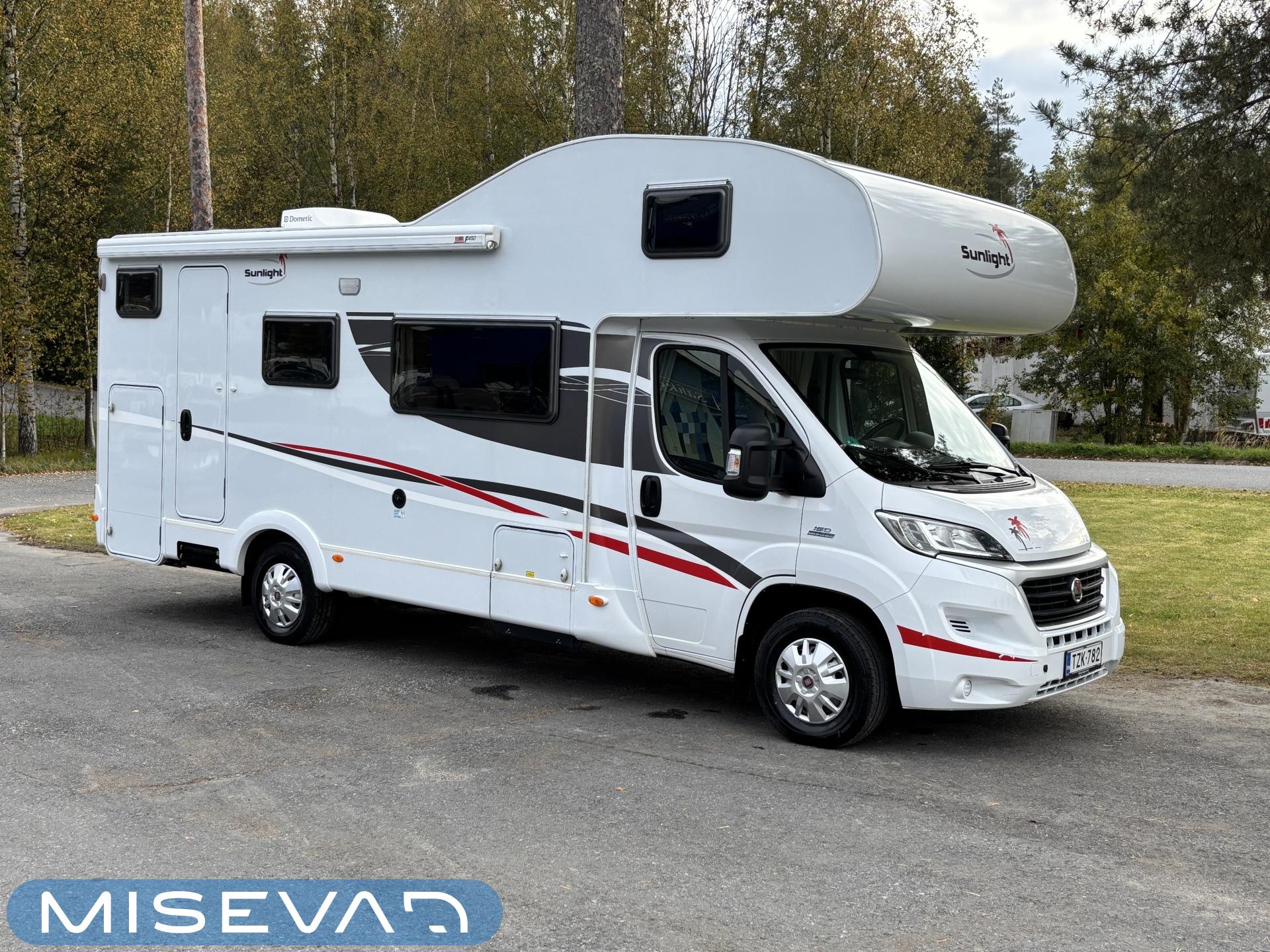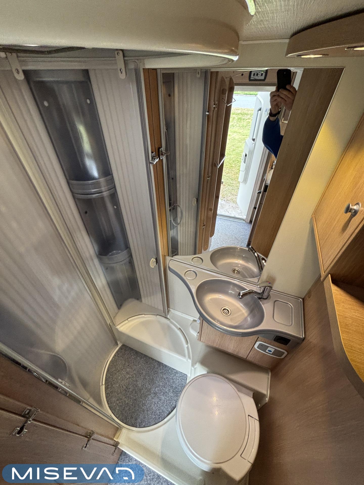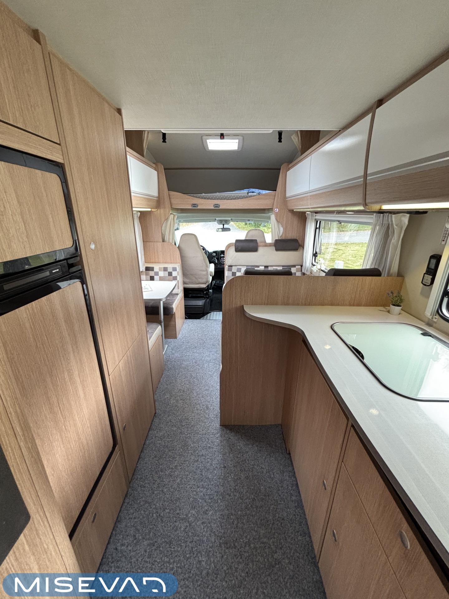 Nyt on tilaa temmeltää! Tämä todellinen perhevankkuri kerrosvuoteilla ja kahdella pöytäryhmällä tarjoaa vuodepaikat jopa seitsemälle yöpyjälle (rek. matkustuspaikat kuudelle). Ohjaamon päällä olevassa alkovissa köllöttelee mukavasti kaksi henkilöä. 2+2 ja 1+1 pöytäryhmistä saadaan tarvittaessa sijattua vuoteet kolmelle henkilölle. Ja loput kaksi makoilee taakse poikittain sijoitetuissa kerrosvuoteissa. Kerrosvuoteista alemman saa nostettua ylös, jolloin tarjolla on ”takatalli” säilytystilaa tavaroille. Tietysti tästä löytyy vielä keittiö, sekä WC/kylppäritilat. Lämmitysjärjestelmänä toimii Trumaticin tehokkain (6kw) ilmakeskuslämmitys sähkövastuksilla marinoituna. Autossa on oikein mallikas varustelu jo valmiiksi asennettuna. Ilmastointi on ohjaamossa, sekä asuintilassa ja ohjaamon varusteissa myös vakionopeuden säädin ja peruutuskamera. Pihapuolen varusteluista mainittakkoon markiisi, vetokoukku ja pyöräteline. Aika nätti kokonaisuus kyseessä.