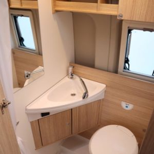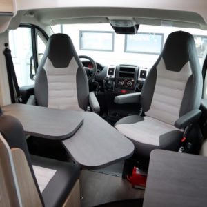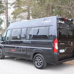 Asuinosan varusteissa mm.: Aurinkopaneeli 115W, Invertteri 2000W, lisäakku asuinosaan, Truma 6E lämmitin, mahdollisuus tehdä vuode istuinryhmästä.