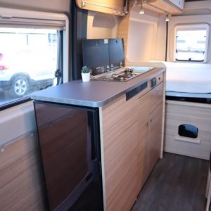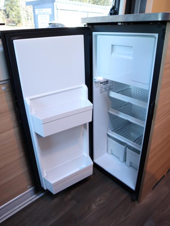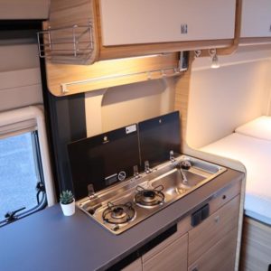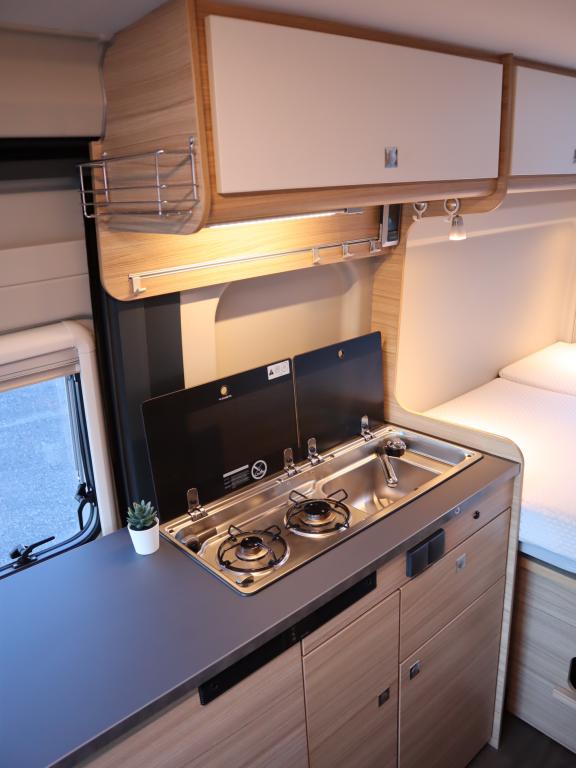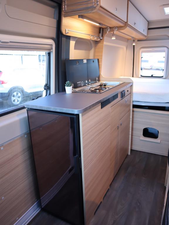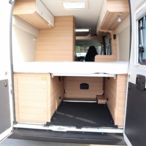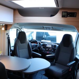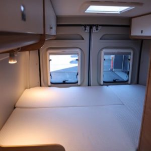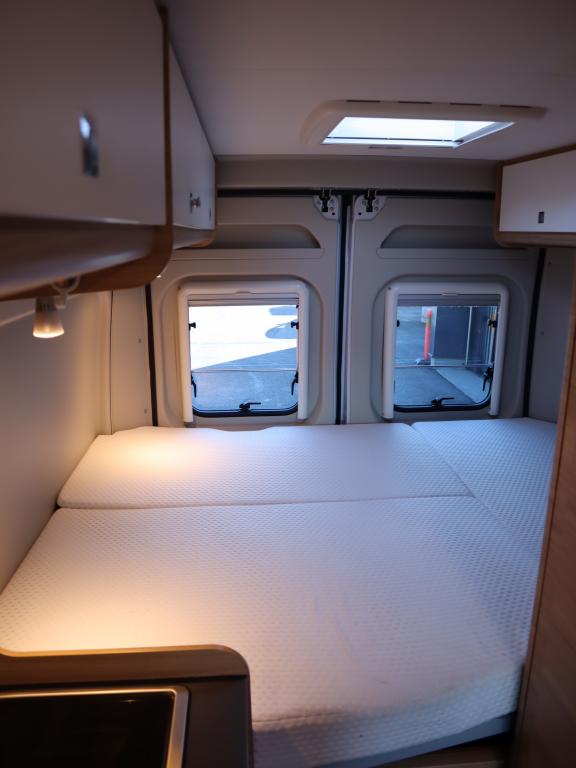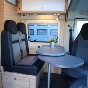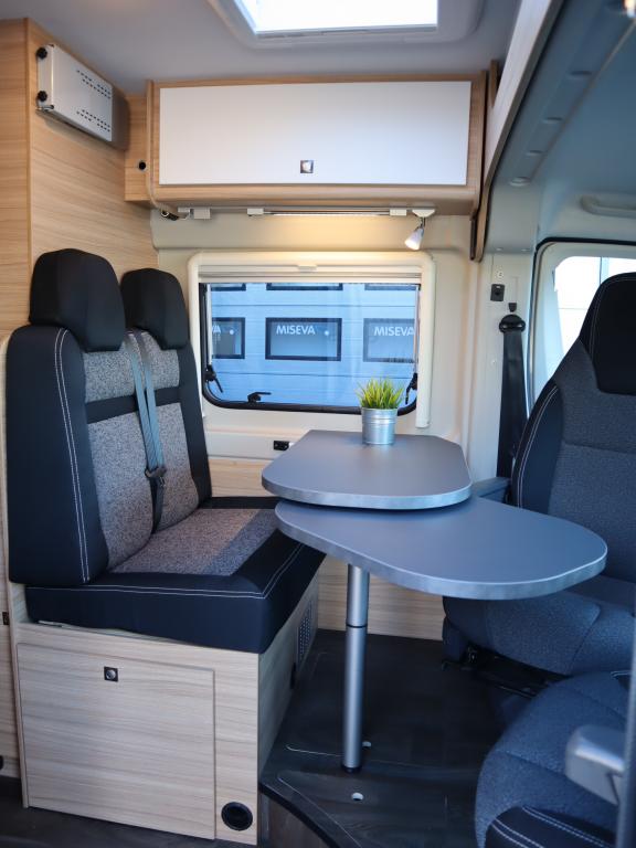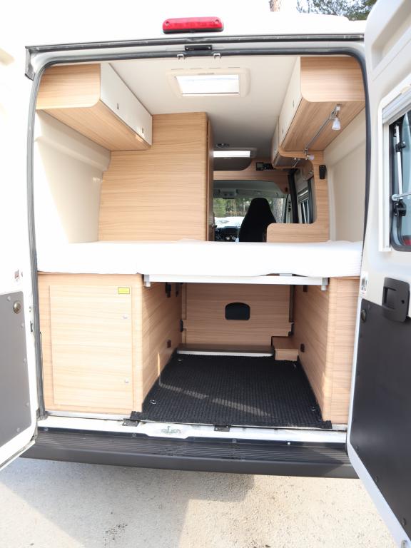 Auton takaosassa poikittainen parivuode ja tavaratila, edessä valoisa pöytäryhmä neljälle.