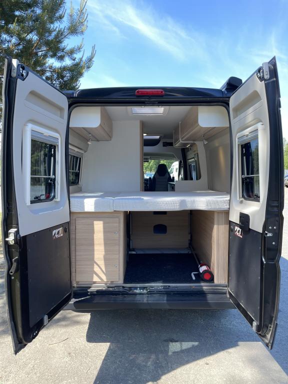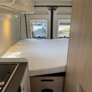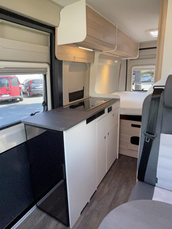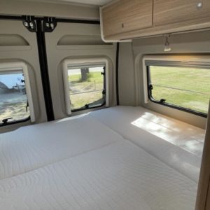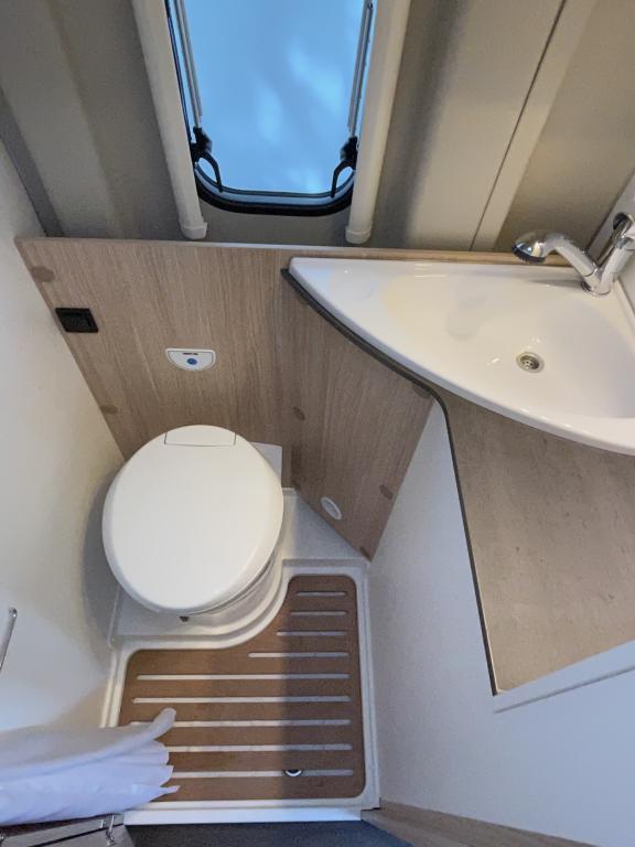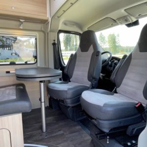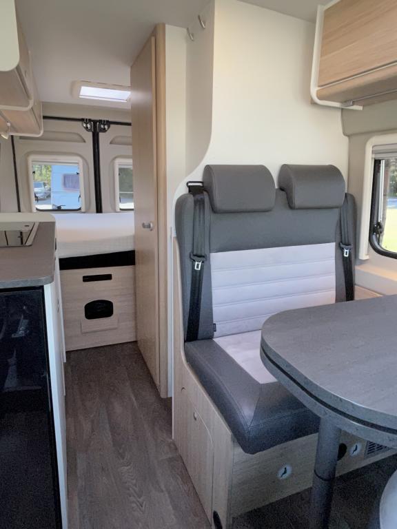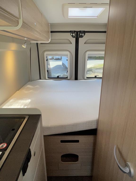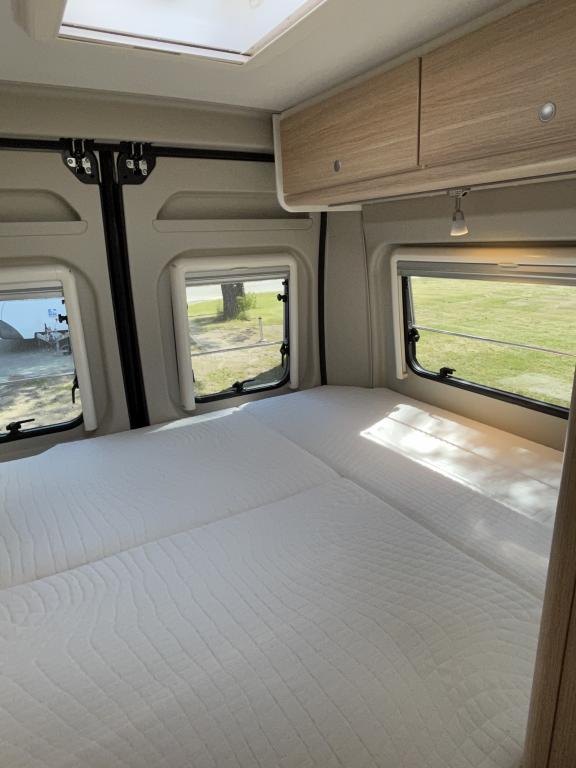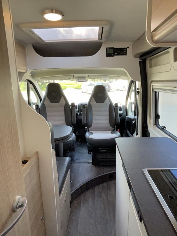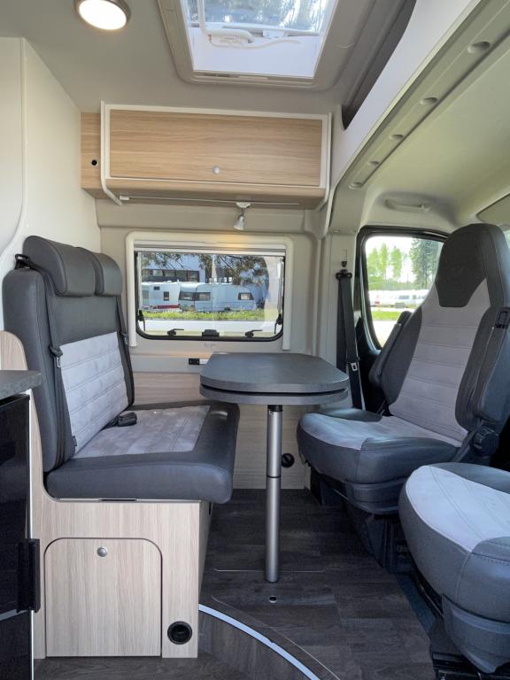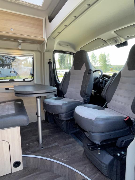 Valoisa pohjaratkaisu, jossa edessä sohvaryhmä ja kääntyvät etuistuimet, keskiosassa keittiö sekä Wc & Suihku-tila, takaosassa poikittainen parivuode jonka alla suuri säilytystila. Takaosan sänky helposti kasattavissa, joten tavatatilaan saa tarvittaessa kokoa entisestään.