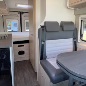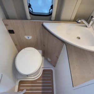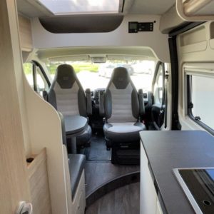 Valoisa pohjaratkaisu, jossa edessä sohvaryhmä ja kääntyvät etuistuimet, keskiosassa keittiö sekä Wc & Suihku-tila, takaosassa poikittainen parivuode jonka alla suuri säilytystila. Takaosan sänky helposti kasattavissa, joten tavatatilaan saa tarvittaessa kokoa entisestään.