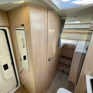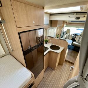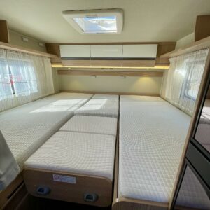 Suosituin pohjaratkaisu jossa takana erillisvuoteet jotka yhdistettävissä ja alla hulppean kokoinen takatalli johon mahtuu kaikki tarvittavat harrastusvälineet mitä reissussa tarvitaan. Keskiosassa olevassa L-keittiössä valmistat maittavat eväät ja apuna auttaa iso jenkkijääkaappi.