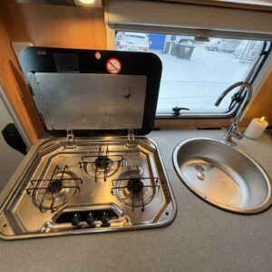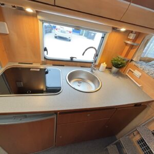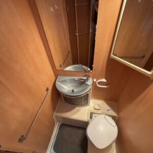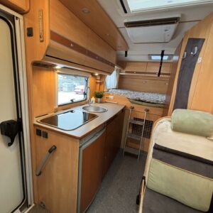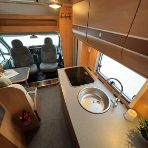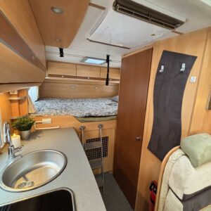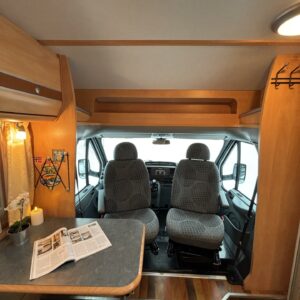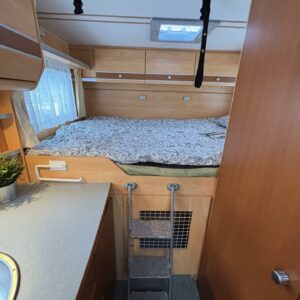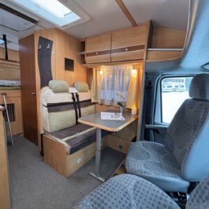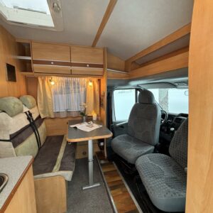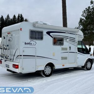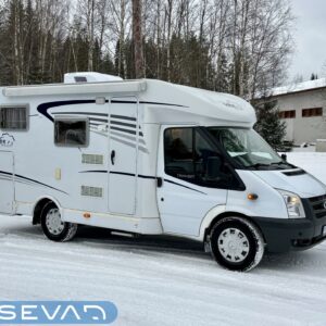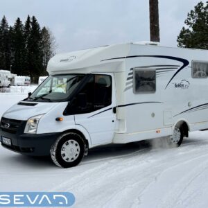 Poikittaisella parivuoteella ja takatallilla varustettu alle seiskametrinen matkakoti esimerkiksi pariskunnille. Tässä yksilössä ajomääräkin on vielä ihan maltillisella tasolla. Auton takaosassa on poikittainen parivuode ja sen alle jää mukavasti säilytystiloja. Keskelle autoa asemoituu keittiötilat ja toiselta sivulta löytyy kylppäritilat. Edessä on pöytäryhmä minne yhdistyvät kääntyvät ohjaamon penkit. Lämmön pirttiin toimittaa Trumaticin tehokkainta mallia (6kw) oleva ilmapuhalluslämmitin ja se on kaasukäyttöinen. Autossa on tietysti myös normaalit matkailuajoneuvon varusteet, eli löytyy jääkaappi, lämminvesiboileri, sekä liesi. Kesäkuumalla viilennys tapahtuu ajon aikana ohjaamoilmastoinnilla ja leirissä kattoilmastoinnin avulla (tarvitaan verkkovirta). Pari fillaria matkaa kätevästi mukana takaseinälle sijoitetussa pyörätelineessä. Löytyypä autosta vielä pienille verkkovirtalaitteille tarkoitettu 600W siniaaltoinvertterikin ja aurinkopaneeli. Ajettavissa henkilöauton B-kortilla ja rekisteröidyt matkustuspaikat neljälle henkilölle.