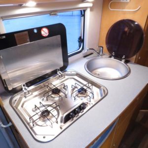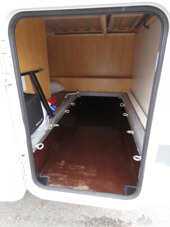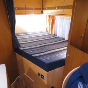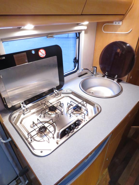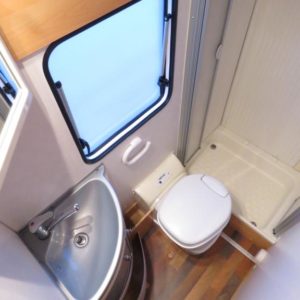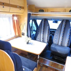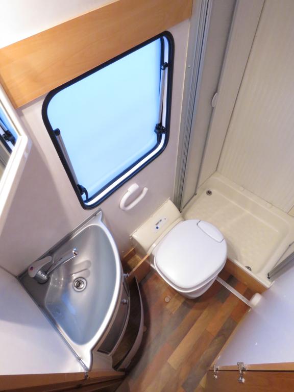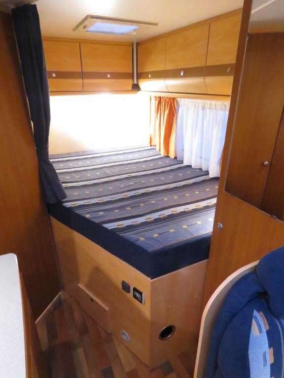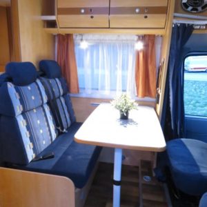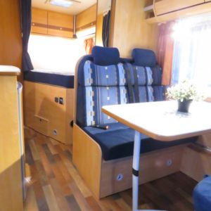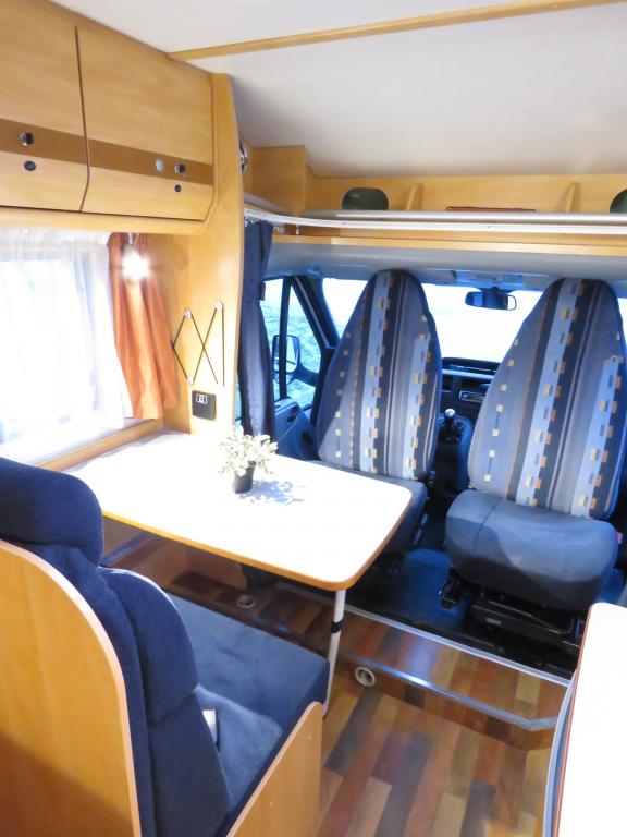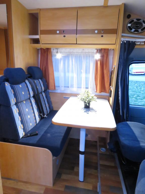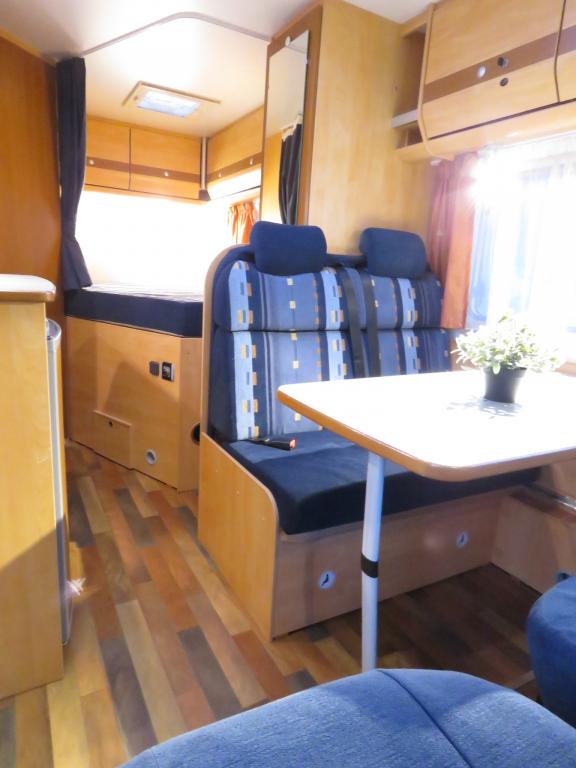 Auton takaosassa pitkittäinen parivuode ja tilava pesuhuone erillisellä suihkunurkkauksella. Auton etuosassa valoisa pöytäryhmä neljälle.