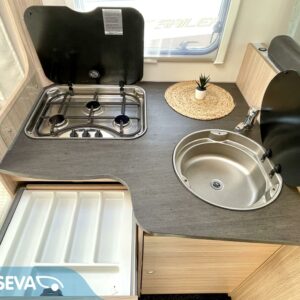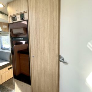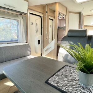 Tilava pöytäryhmä, jonka päällä alaslaskettava vuode, iso jääkaappi-pakastin, tilava keittiö ja mukava parivuode takana, tilavat saniteettitilat, tästä erittäin siisti ja vähän ajettu yksilö, pariskunnille tai vaikka perhekäyttöön.
