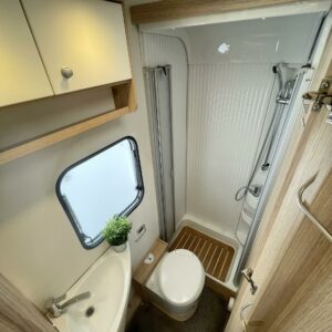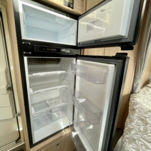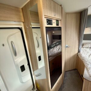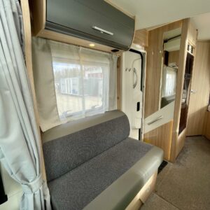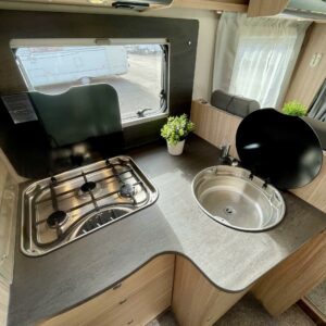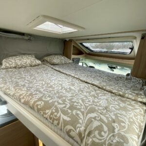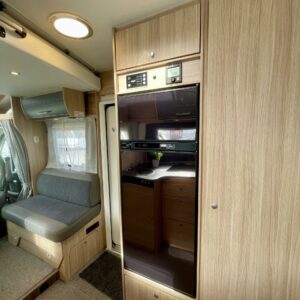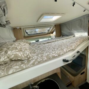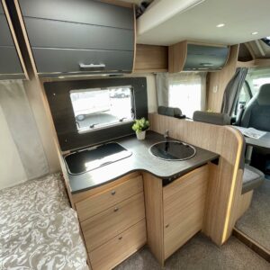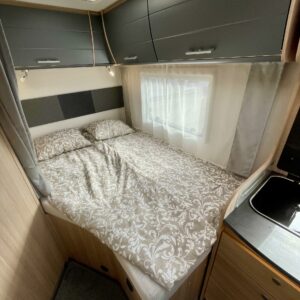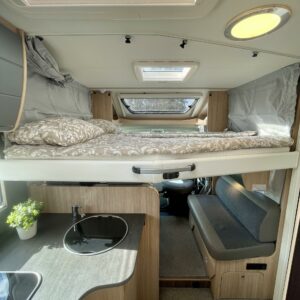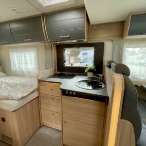 Olohuoneen yläpuolella on alaslaskettava vuode, joka laskeutuu alas niin, että ulko-ovesta pääsee edelleen kulkemaan. Keskiosassa sijaitseva L-keittiö on sekä tyylikäs että toimiva. Rustiikkisen harmaat pinnat tuovat modernia ilmettä ja kestävät käyttöä. Keittiössä on hyvin laskutilaa ja kaikki tarvittava ruoanlaittoon tien päällä. Perältä löytyy pitkittäinen parivuode ja sen vierestä kylpyhuone.