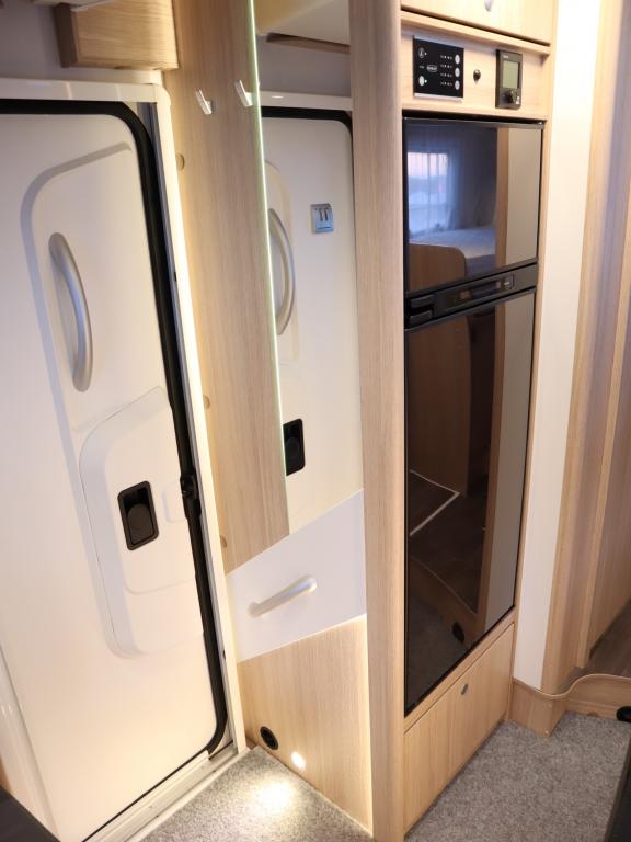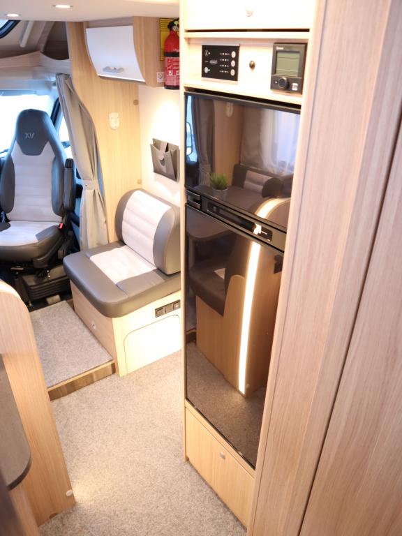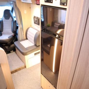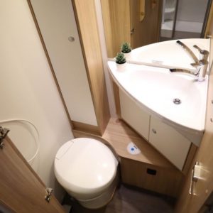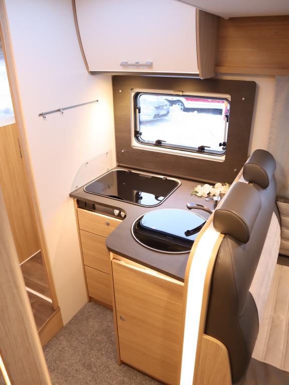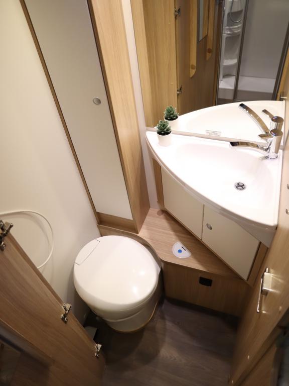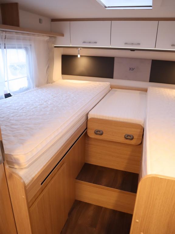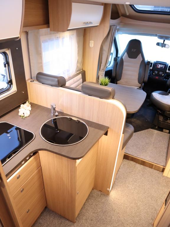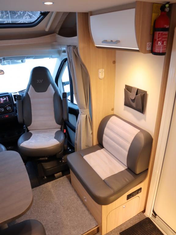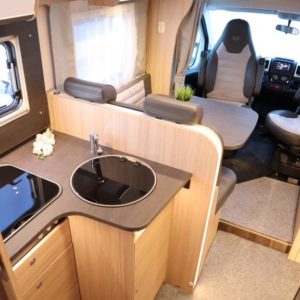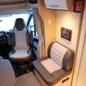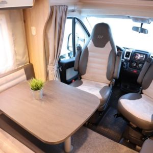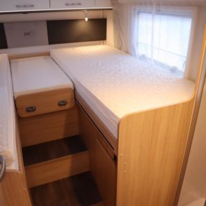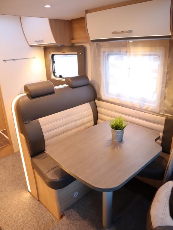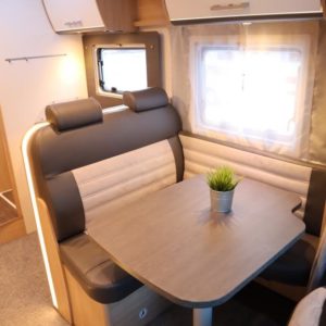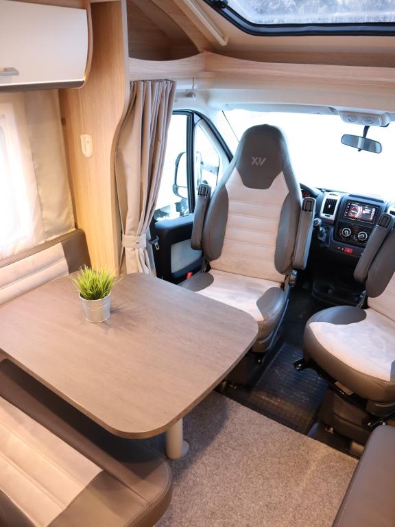 Edessä tilava pöytäryhmä kääntyvin ohjaamon istuimin. Pöytäryhmän yläpuolella katosta laskeutuva lisävuode. Keskellä L-keittiö korkealla jääkaapilla.Takana WC/ Erillinen suihku ja pitkittäiset erillisvuoteet. Vuoteiden alla suuri tavaratila,mihin luukut molemmin puolin.