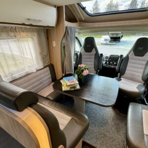 Auton etuosasta löytyy lyhyellä sivusohvalla ja kääntyvillä etuistuimilla ”ryyditetty” L- pöytäryhmä. Pöytäryhmän päälle laskeutuu tarpeen vaatiessa lisää makuupaikkoja nostovuoteen muodossa.