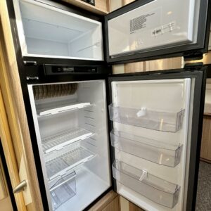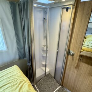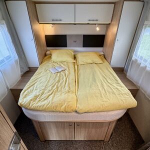 Auton takaosassa on muhkean saarekevuoteen lisäksi erilliset WC-/ suihkutilat. Takapään saa nerokkaan ovisysteemin ansiosta tarvittaessa eristytettyä muusta asunto- osasta.