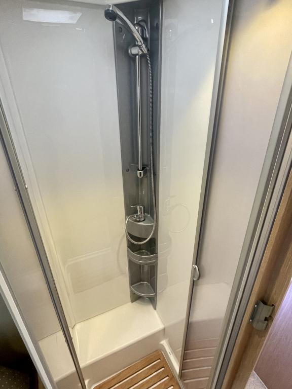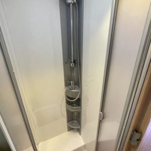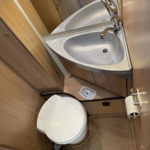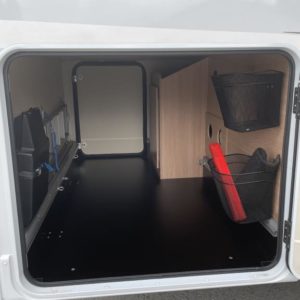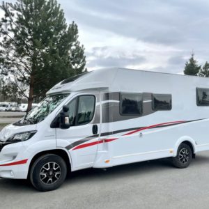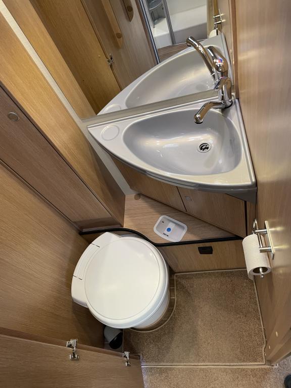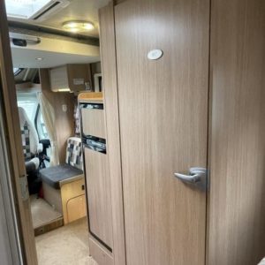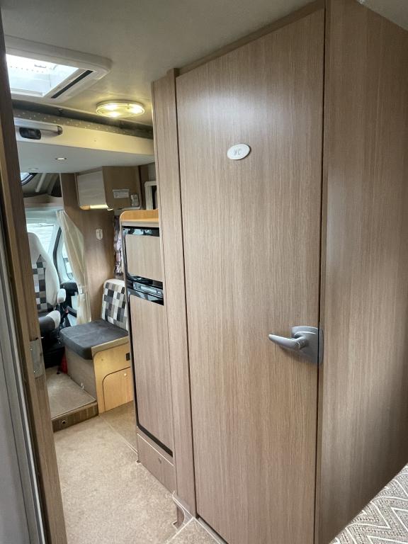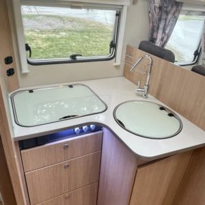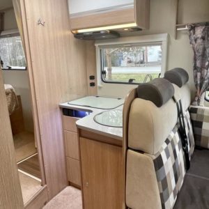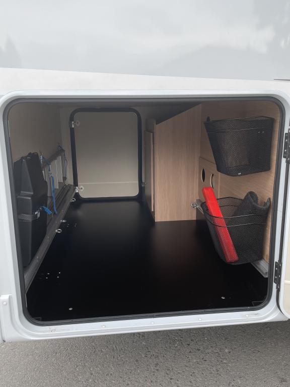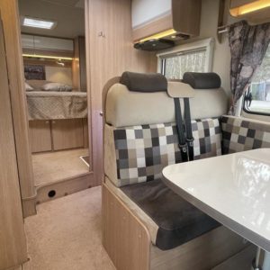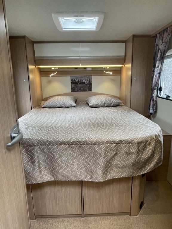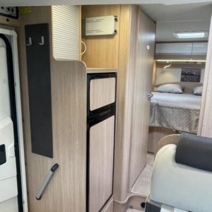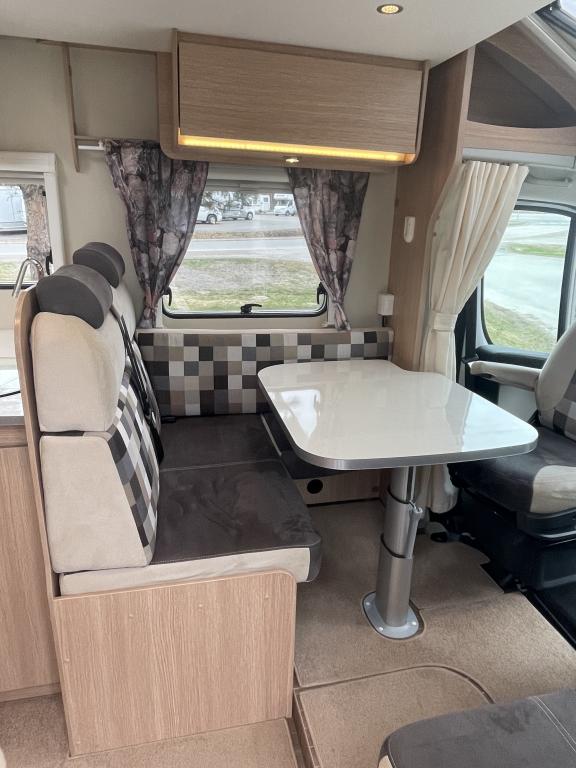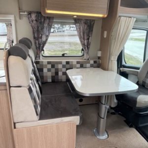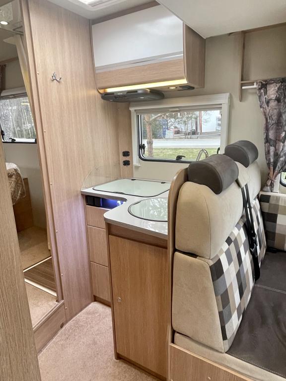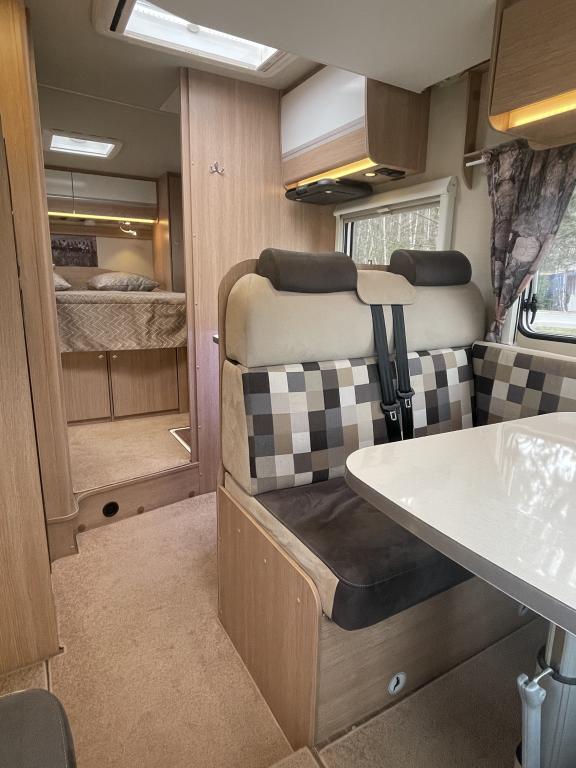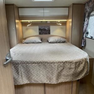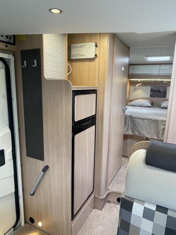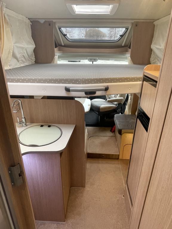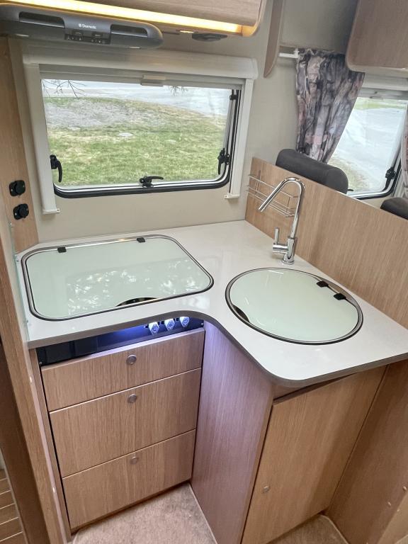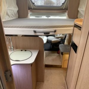 Auton takaosassa muhkea saarekevuode ja erilliset suihku/ WC -tilat, edessä valoisa pöytäryhmä lyhyellä sivusohvalla. Lisää makuupaikkoja tarjoaa katosta laskeutuva nostovuode. Keittiön varustuksen täydentää jääkaappi erillisellä pakastinlokerolla.