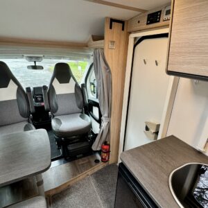 Auton etuosassa on viihtyisä pöytäryhmä neljälle. Iso kattoluukku tuo kivasti valoa koko autoon.