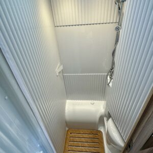 Saniteettitiloista löytyy kääntyvän seinän ansiosta asialliset tilat myös retkisuihkun ottamiseen.