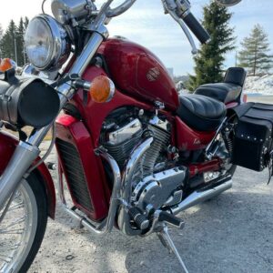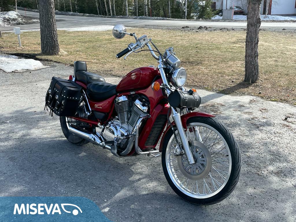 Kesä tulee väistämättä! Kuuma asfalttitie huutaa käskyttäjää tälle hienolle, hyvinkin alkuperäiskuntoisen oloiselle Intruderille. Tällä kun puottellee kohti auringonlaskua Reibanit (ei kaupallista yhteistyötä) silmillä ja samalla kuuntelee katu-uskottavaa 750cc. V-twin moottorin jytinää, niin siinä kaikki arkihuolet kaikkoavat mielestä siltä istumalta. Siistikuntoinen peli kaikin puolin (toki joitain käytön jälkiä on) ja renkaatkin vielä ihan ajettavassa kunnossa. Matkatavarat mahtuu mukaan mukavasti Richan nahkaisiin sivulaukkuihin ja jos näissä joskus jotain vikaa olisi, niin työkaluja voi ottaa varuiksi mukaan nahkaiseen työkalurullaan. Mukaan löytyy myös pleksi. Viimeisin huolto (moottoriöljyt + suodatin + peräöljyt) tehty vuoden vaihteessa ja sen jälkeen ei ole ajettu. Born to be Wild ja tule hakemaan tämä stressin poistaja omaksesi ennen kun muut ehtivät!